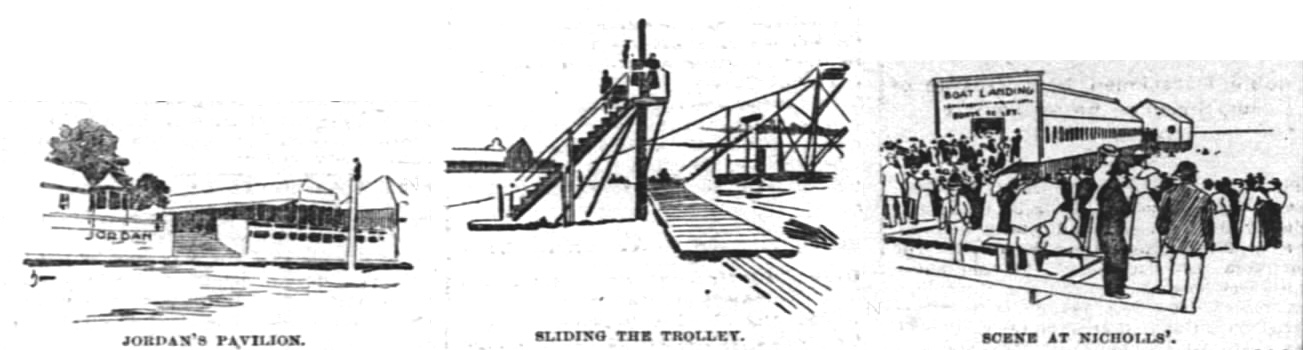Across the beach from Jordan’s is the watermelon patch. This is liberally patronized. The pavilion is built directly over the lake, and clam chowder and other refreshments were served here to throngs of people dally.