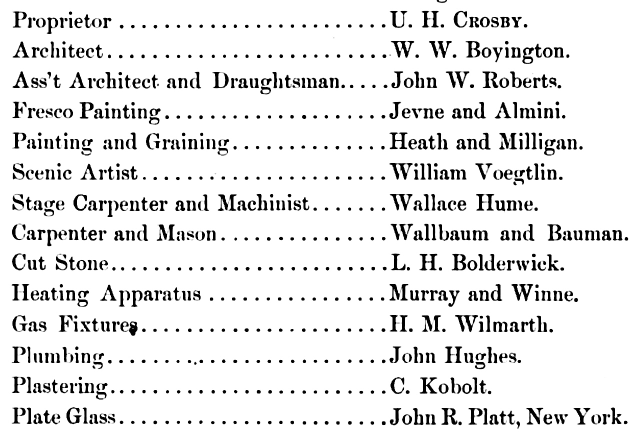 In 1863, Mr. Uranus H. Crosby, of Chicago, a gentleman of means and of great enterprise, conceived the idea of building in this city an edifice of this kind, which, while designed to be of personal profit to its projector, should also be a credit and an ornament to the city, and give stability to the growing interest of the fine arts. Filled with this most honorable ambition, he, in company with W. W. Boyington, Esq., an architect of Chicago, visited the other cities of the country, examining with care all the buildings erected for like purposes, profiting alike by the practical excellencies and the practical defects which they witnessed. The results of this careful and deliberate examination was the plan of the present building, which, without exception, is generally acknowledged the best designed structure of the kind in America. It embraces all the conveniences and excellencies of the various similar establishments, and as few of their deficiencies as possible. The front of the building combines simplicity with massiveness, and the ornamental designs are sufficiently elaborate, and yet do not, as is too often the case, spoil the general effect. In the centre is a projection which is twenty-three feet wide, through which is an arched entrance to the building. Upon the parapet above this entrance are placed four statues, representing respectively Painting, Sculpture, Music, and Commerce. These were designed and execute by L. W. Volk, Esq., a sculpture of Chicago. Higher in this same central projection are two large figures, designed also by Mr. Volk, representing Music and the Drama. These are placed one on each side of an elaborate dormer window.