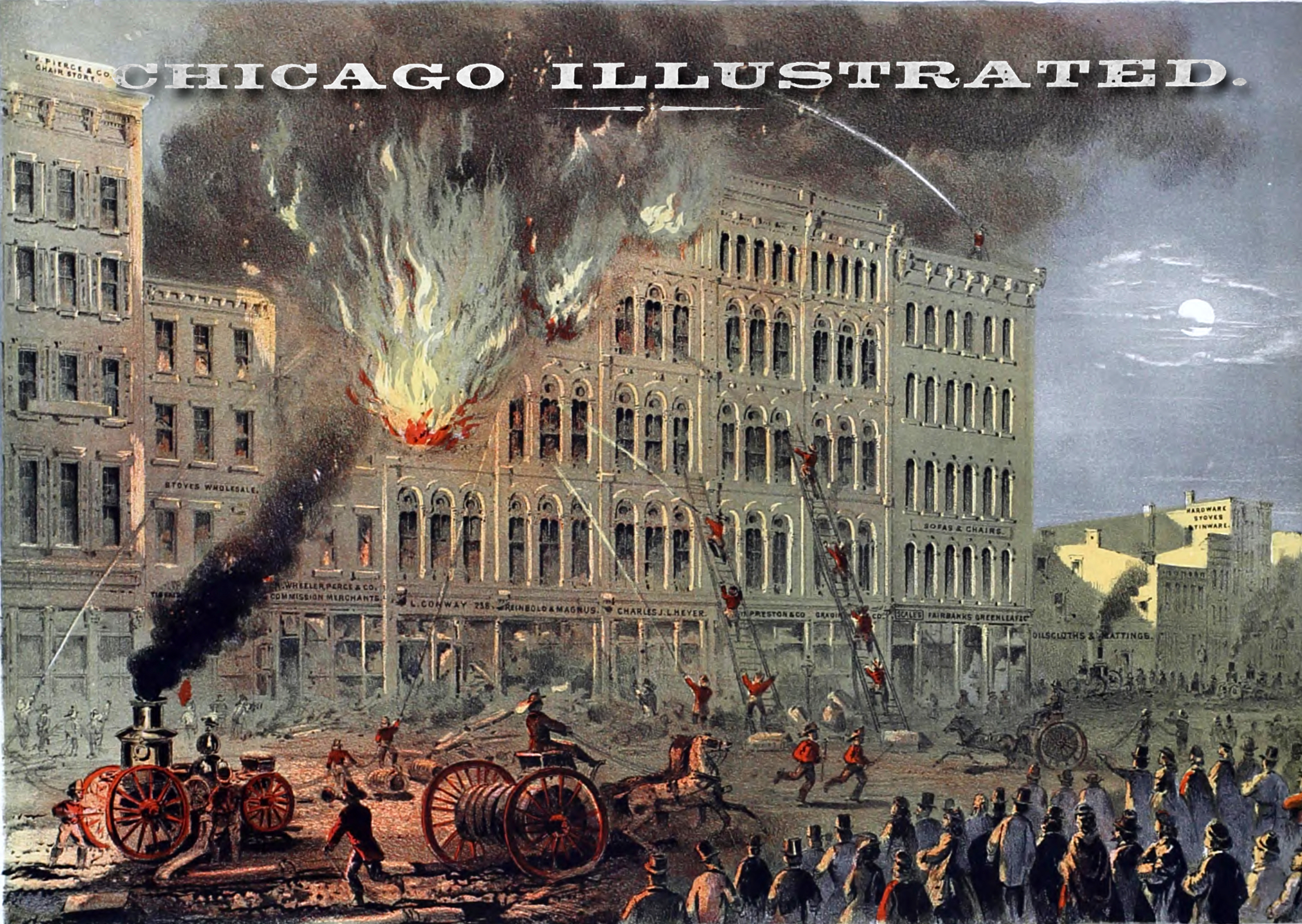 Fire Department—This scene represents the burning of the marble front block on Lake street, west of Franklin street, in the Fall of 1865. The fire was an obstinate one. It originated in stores on Water street, and burned through to Lake, and presented difficulties of no ordinary character. The Fire Department, however, was equal to the work; they confined the destruction to the premises actually on fire when they reached the scene.