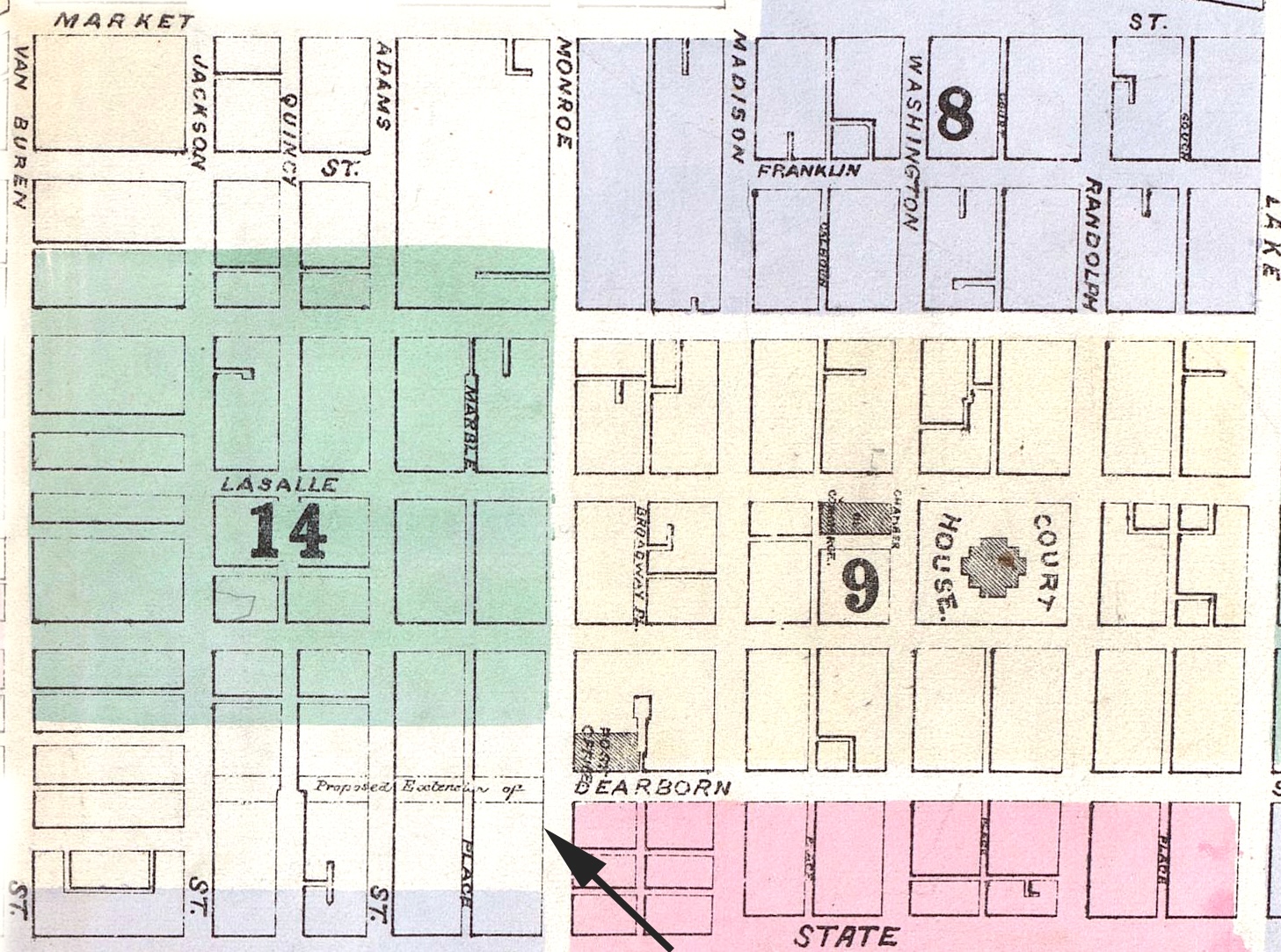 Prior to 1869, Dearborn Street ended at Monroe Street. Shepard’s Block was the first building to be built on the south side of Dearborn after Monroe Street.