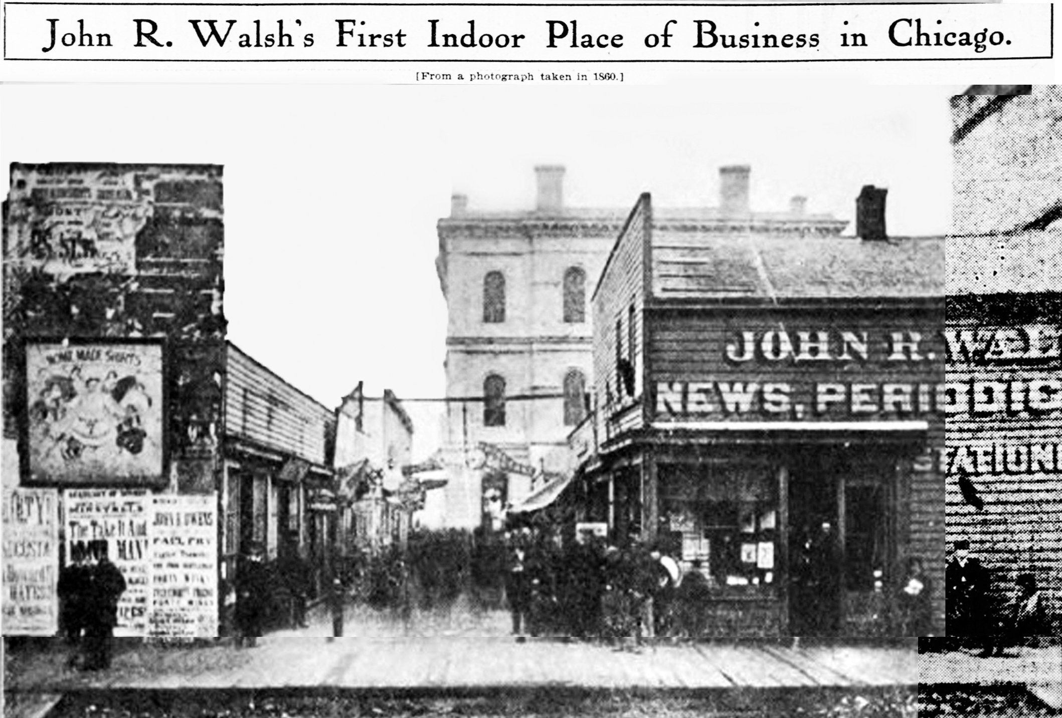 - John R. Walsh’s news depot with the Custom House/Post Office behind it. In 1864, Walsh’s building was replaced by Reynolds’ Block.