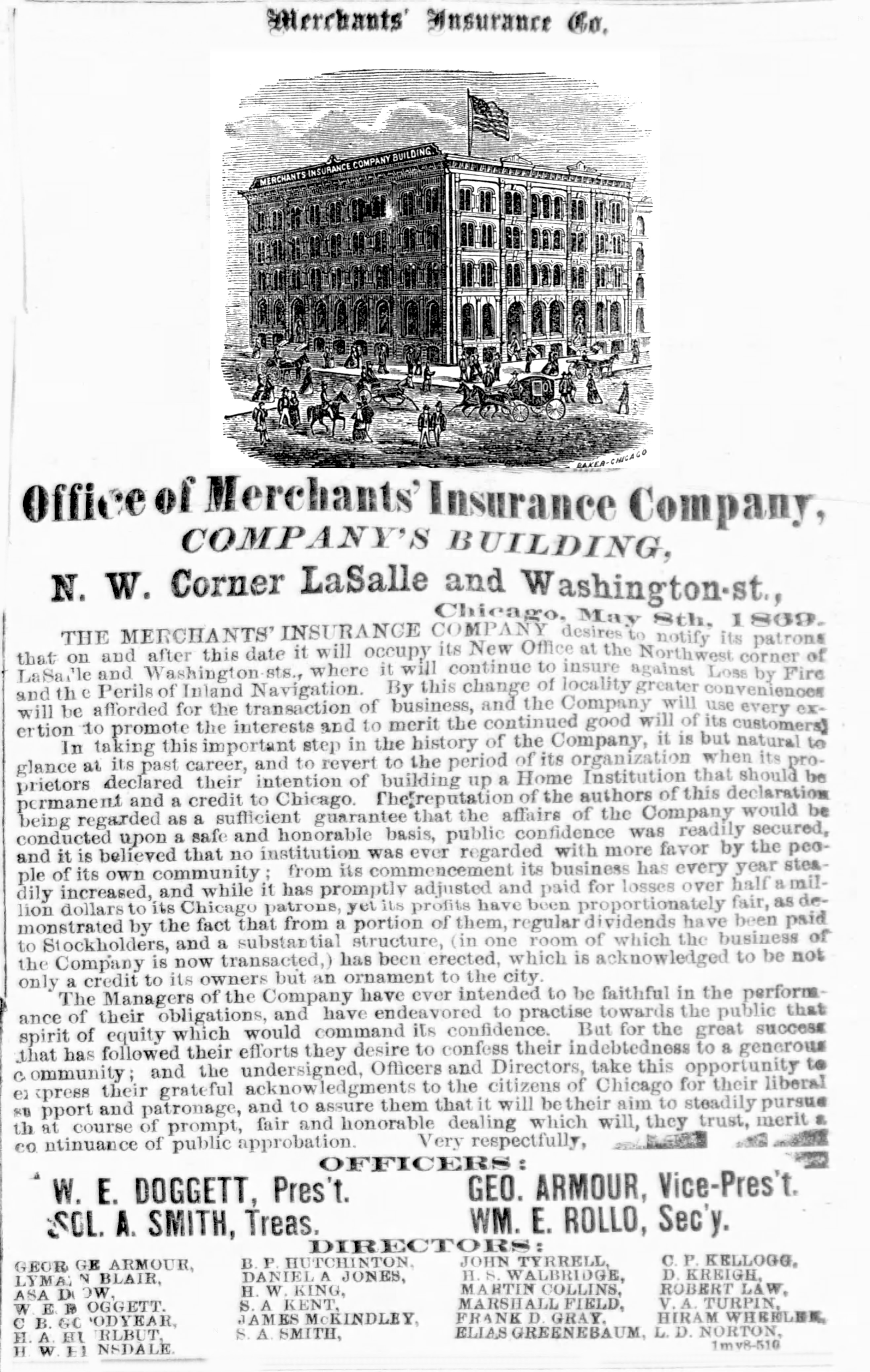 Merchants Insurance Co. of Chicago—William E. Doggett, pres. George Armour, vice pres. William E. Rollo. sec. LaSalle, nw cor. Washington