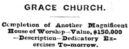 The costly house building of Grace Methodist Church on the corner of North LaSalle street and Chicago avenue is nearly completed and it is to he dedicated about the first of July.