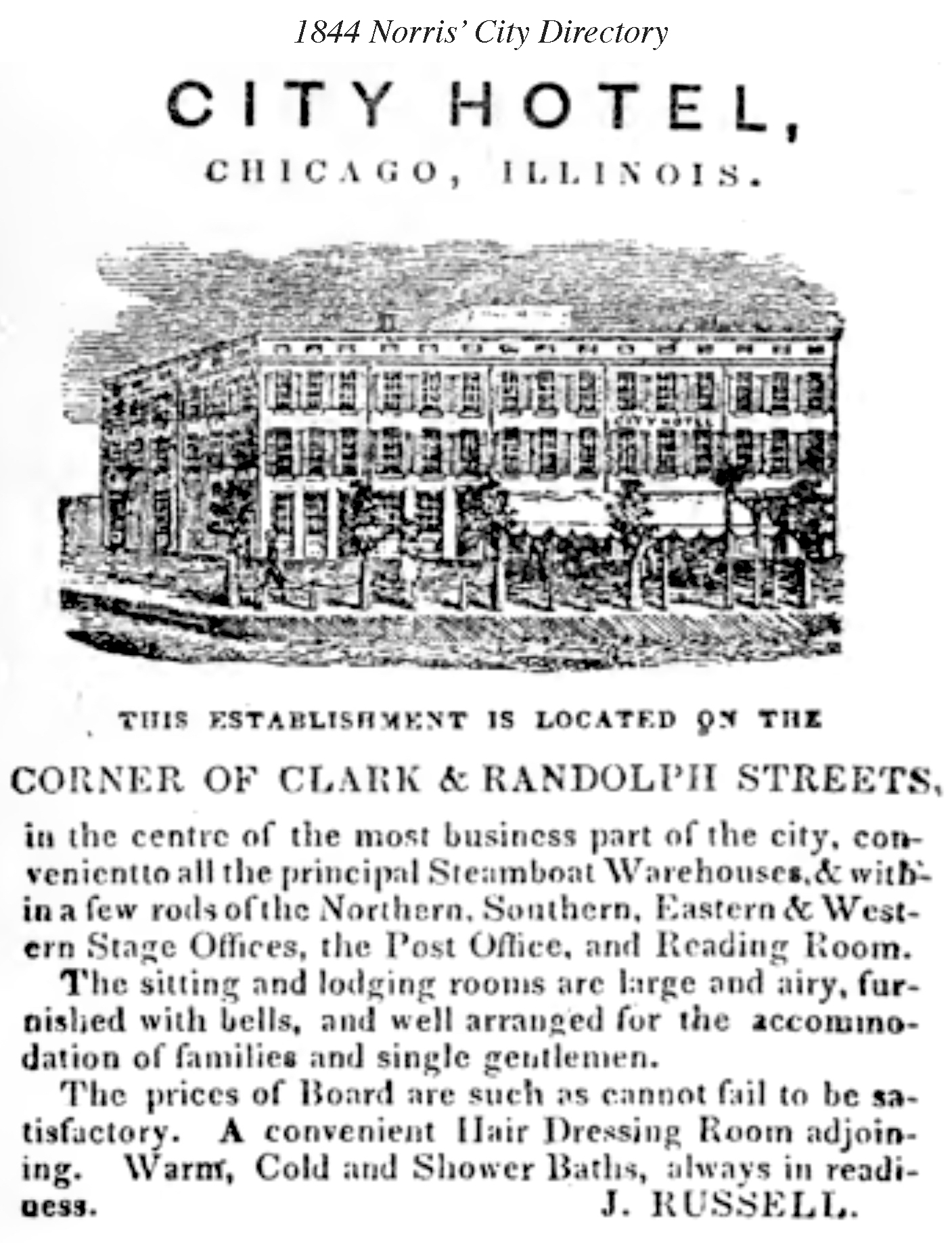 The present Sherman House was built in 1837 by Francis C. Sherman, Esq.. It was originally the “City Hotel”—it was a three story building one hundred feet front on Clark by fifty on Randolph. The late lamented Jacob Russel, Esq., who had been the host of the Lake House, took charge of this, the new and then crack hotel of Chicago, and we find by “Norris’ City Directory” published by Ellis & Fergus in 1844, “being the first Directory ever published in Chicago,’ that he was still landlord of the City Hotel in that year.