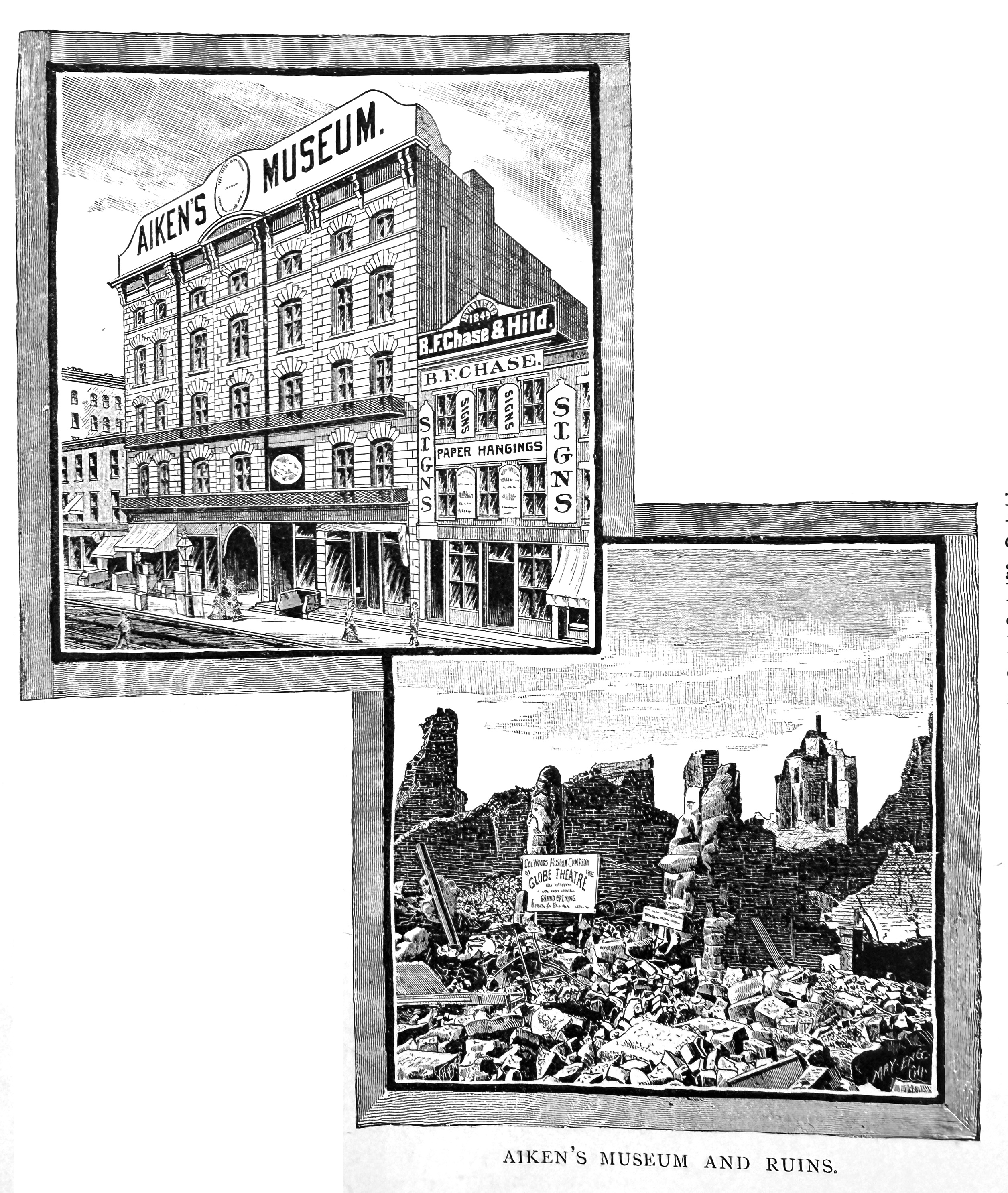 To the right of the Museum, is the justly celebrated sign painting establishment of B. F. Chase, who for twenty years has been the sign artist of Chicago. The business of the establishment is now carried on by Chase & Hild.