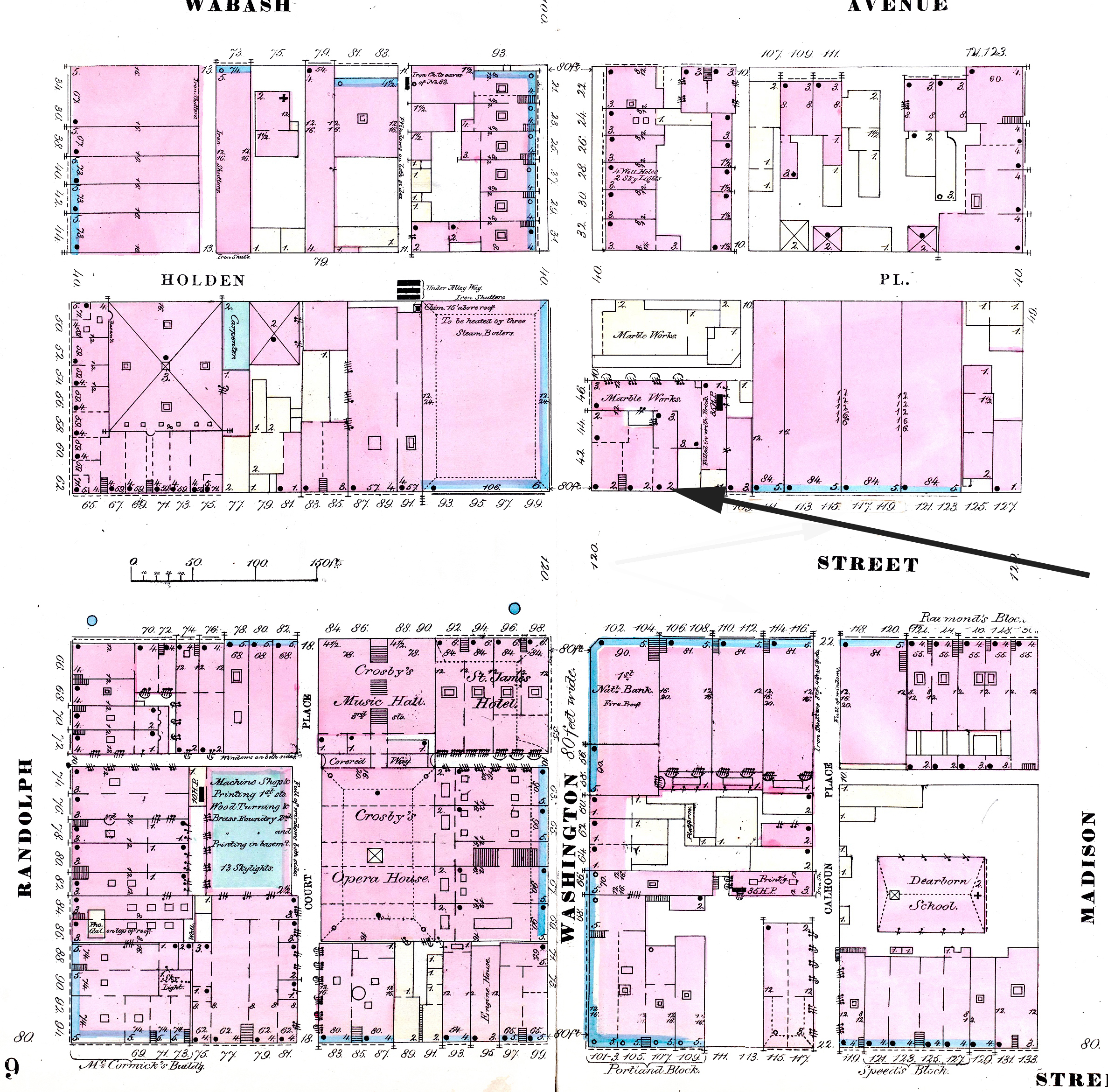 The southeast corner of State and Washington streets is to be occupied by a building which will compare favorably with the structures opposite in either direction. With the exception of the low brick building which now holds the extreme corner, and which cannot be removed within two years, the new block will have a front of one hundred feet on State, and ninety on Washington street. It will be of brick, the first story front of iron and polished French plate glass of unusual size, and the remainder of the front of Ohio sandstone. The building, five stories and basement, will be finished throughout in the most elegant and expensive manner, and will cost $120,000. The contract calls for its completion by November 15.