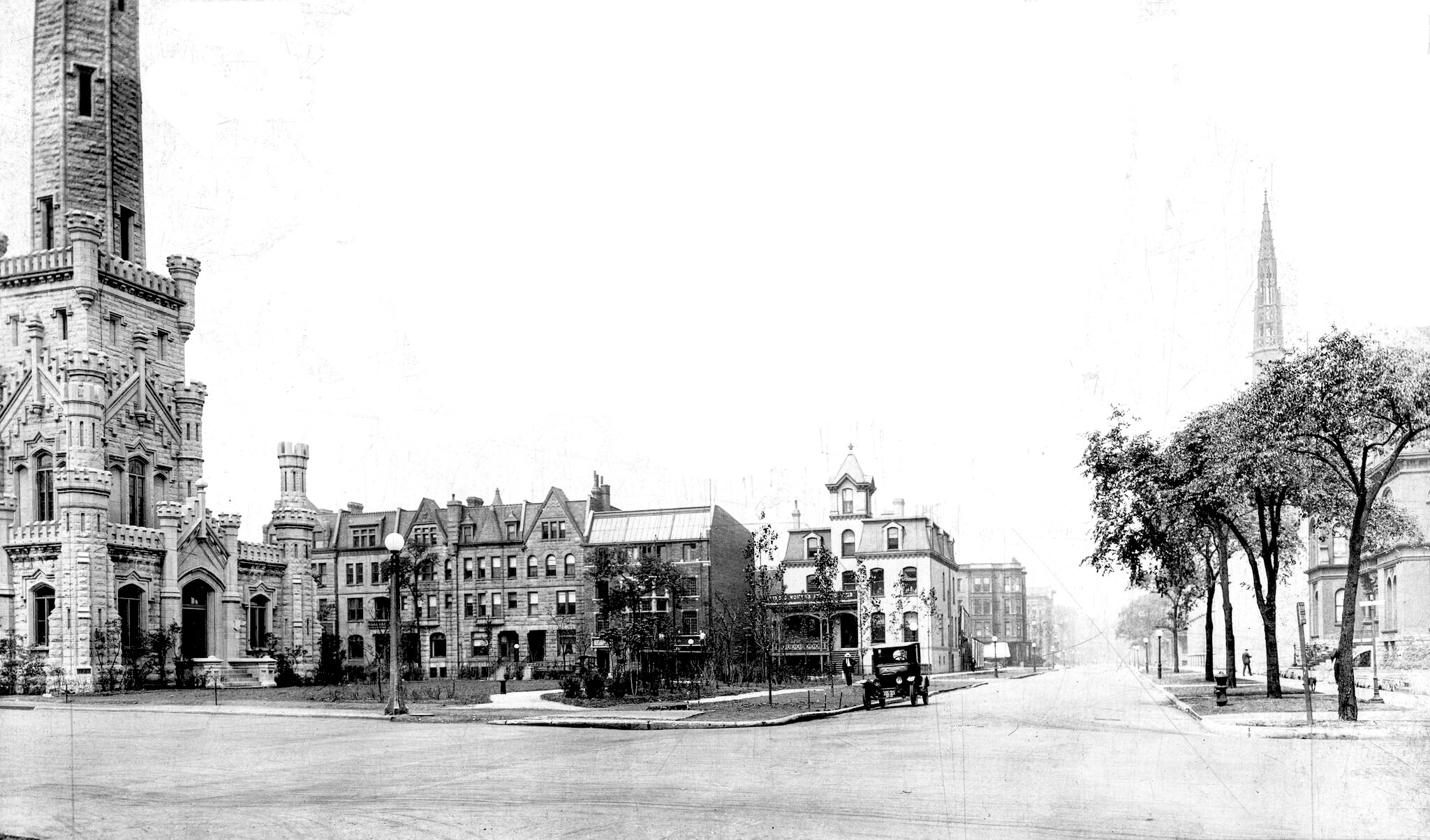 - View looking west along Pearson Street. Quigley Preparatory Seminary steeple on the right,
