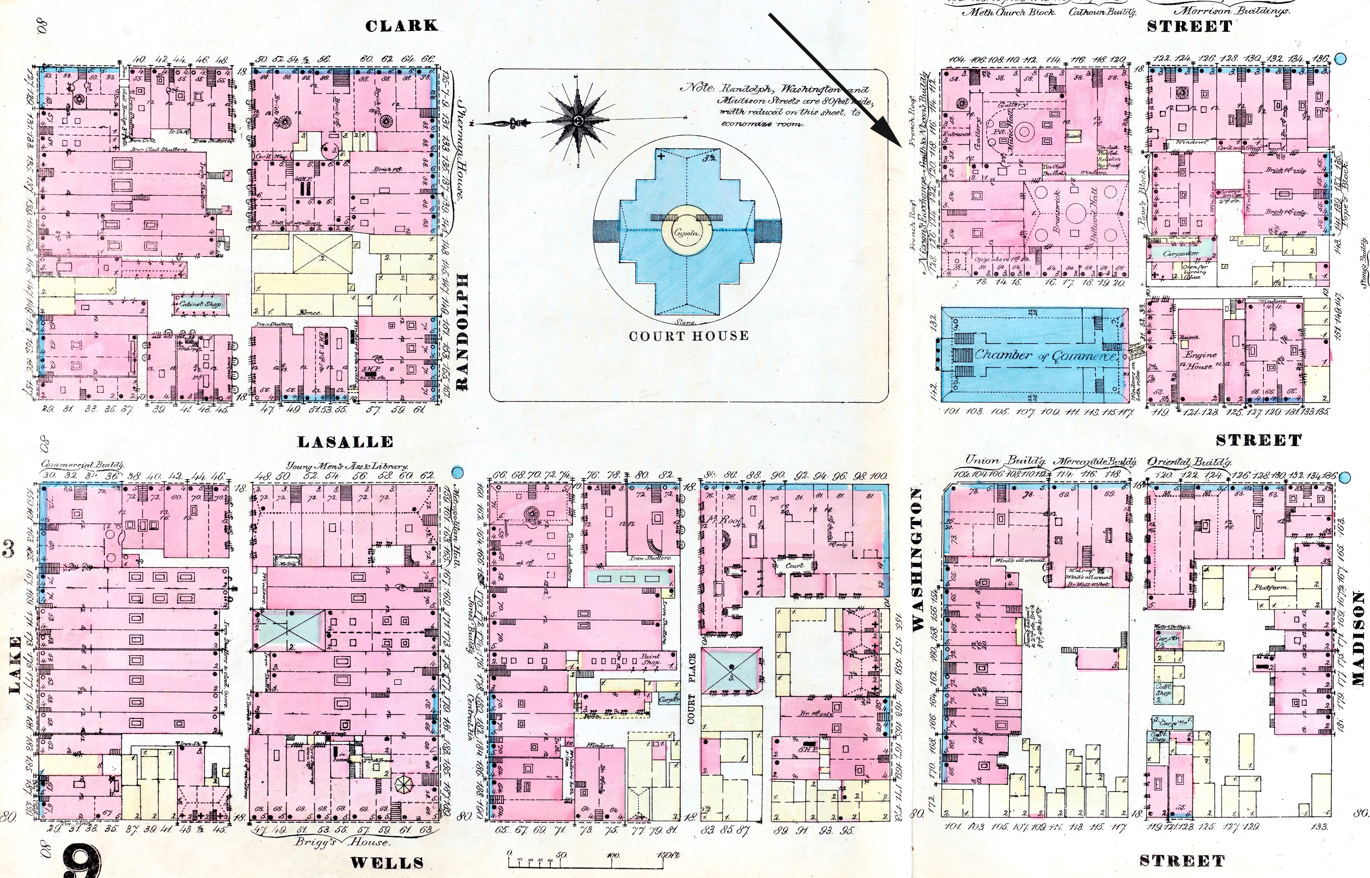 A very fine Music Hall is in course of erection for Smith and Nixon, on the corner of Washington and Clark streets—the opposite corner to the Chamber of Commerce building. The hall which is to be used for operatic or lecture purposes, will be in the centre of a fine block 108 feet front on Washington street, 152 on Clark. This block will be four stories in height with basement, and constructed of pressed brick, highly ornamented with carved stone work. Round the main entrance, which is on Washington street, sixteen feet wide, will be some handsome pilasters running the roof, where they terminate in a massive circular pediment. The windows will all be double beaded, and capped by finely cut arches, while intricately carved mullions separate each two, and every corner of the structure is relieved by handsome marble quoins. Round the roof an elegant medallion cornice will run, and over the main entrance, and at the two ends of the front of the structure will be massive marble balconies. The style of architecture is Florestine, and the cost of construction, including the slate roof, will be about $90,000. The music hall will be fitted up in a truly magnificent manner, and is situated in the very centre of the block, removed from all street sounds. Owing to its position it will be lighted from above.