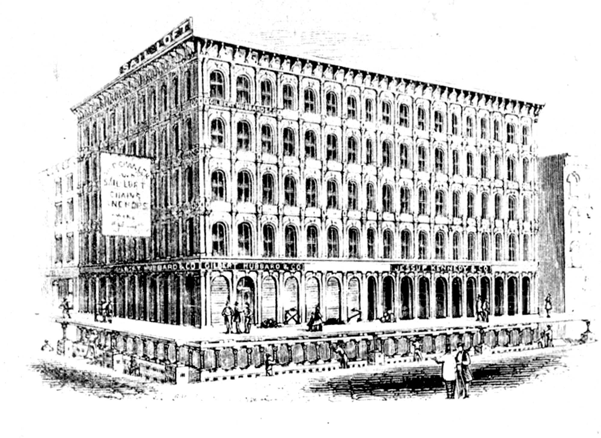 The Robbins Building an iron-front building by John Van Osdel commissioned by Allen Robbins for the city’s first iron structure. It was to be a combination of store, offices, warehouse at the SE corner of South Water (Wacker) and Wells streets, then one of the city’s busiest intersections. Little is known about Robbins. It is clear that he never intended to occupy the building but constructed it as a real estate investment.
