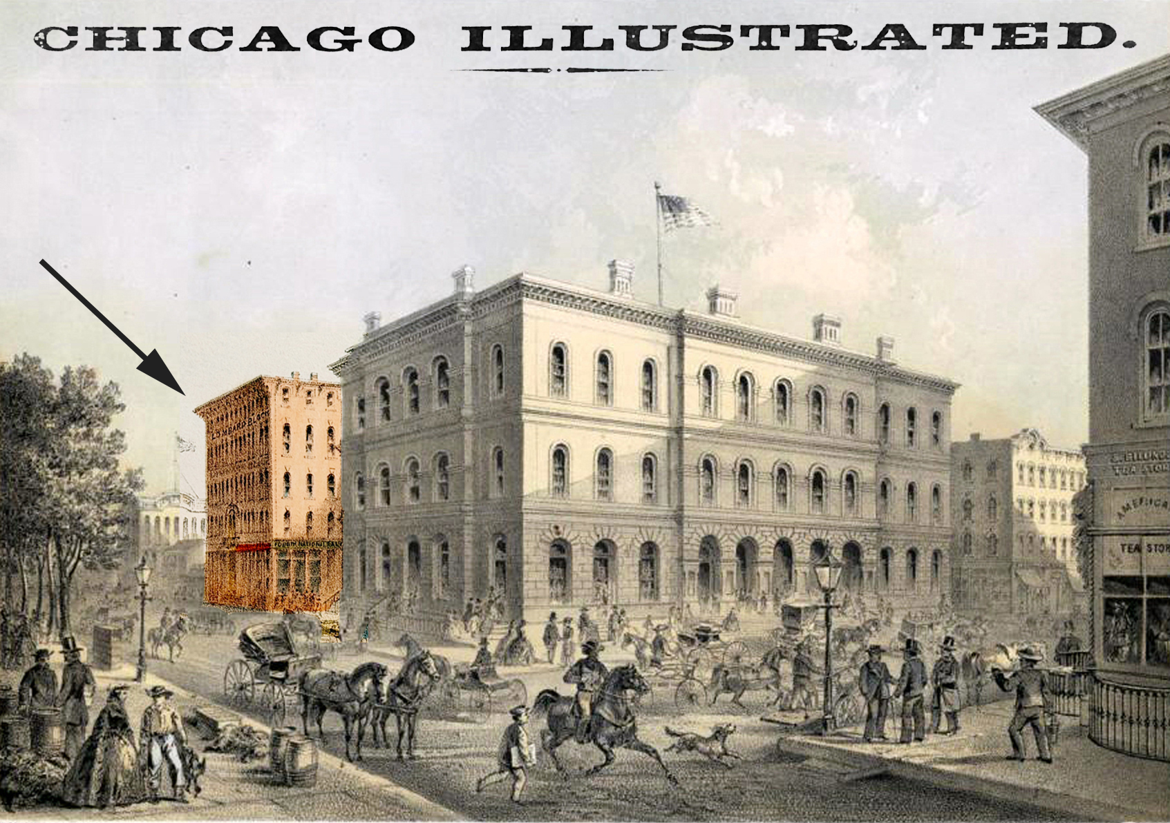 - To the left of the Government buildings may be seen the Monroe-street entrance to the new marble block of Benjamin F. Lombard, Esq., a building nearly equal in size to the Post Office building, built of the same stone and finished in the best style. It is occupied by the Fourth National Bank of Chicago, of which Mr. Lombard is President, and by various insurance and banking companies, brokers, dentists, and other professional business men. To the right is the building known as “Reynolds’ Block,”owned by the Hon. Melville W. Fuller. E. G. Hawley, Esq., represents the Reynolds estate. It extends north to Madison street.