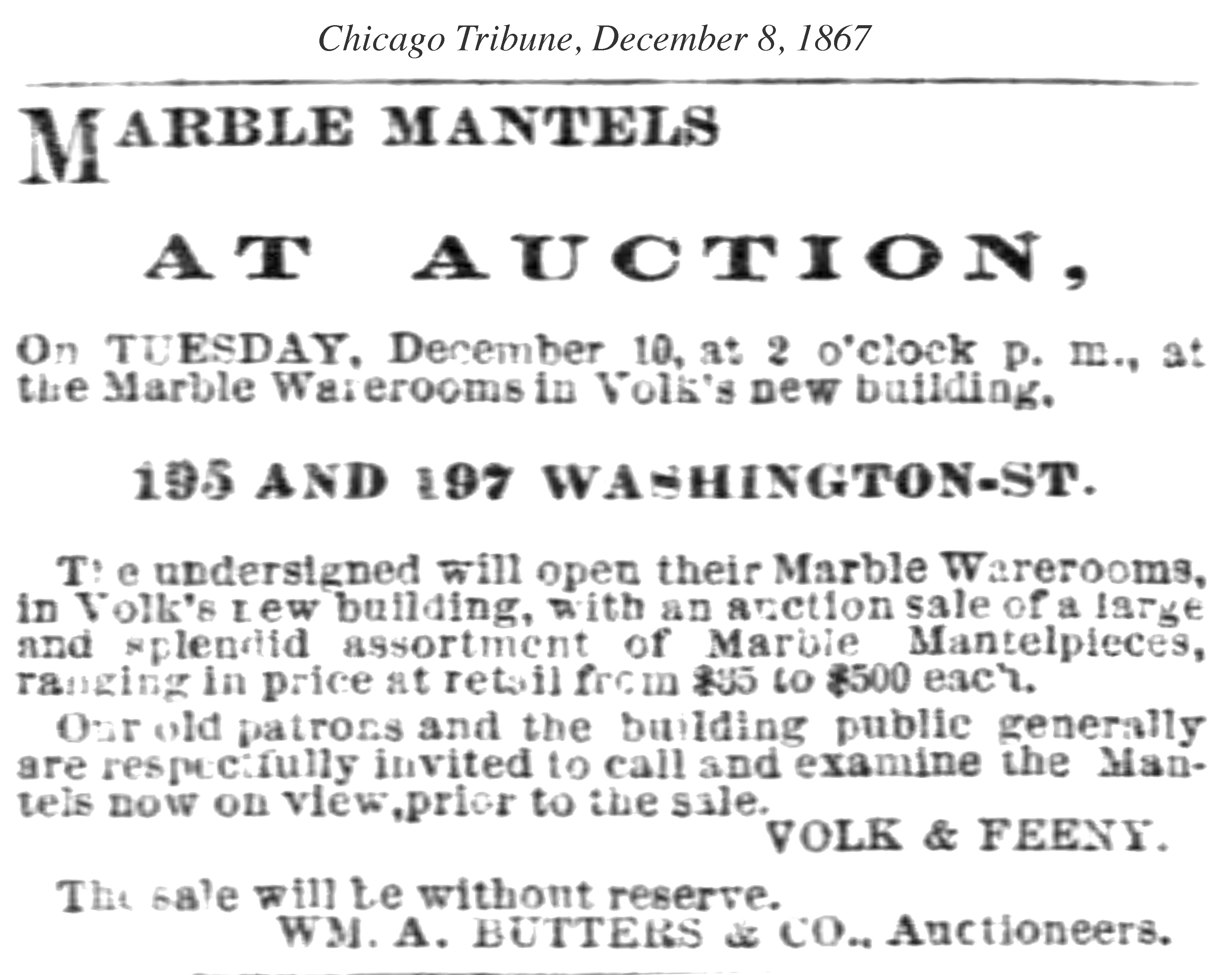Chicago has one of the finest sculptors in America, who has made our city his permanent home, and given us a name abroad for art. To praise the various works of Mr. Leonard Volk is almost a superfluity. The people of the West know all about him, and knowing all about him, are enthusiastic in his praise. For some time past he has been the senior partner in a marble firm, and has paid personal attention to all designs. This fact has made the firm of Volk & Feeny exceedingly popular in their line of business. To accommodate their trade they have been obliged to leave the old shop at the corner of State and Washington street, and occupy the splendid new building erected for the purpose, at Nos. 195 and 197 Washington street. Mr. Volk’s connection with the firm has given it a national reputation, and their orders are from the Atlantic seaboard to the extremes of Nebraska. To be fully prepared for such a business, they have arrangements in full operation for importing marble and stone from all parts of the world, and spare no expense to keep every needed thing constantly on hand. It is scarcely necessary to commend any one who wants a handsome mantel, or an appropriate mark for the resting place of the departed, to go or send to them. They have the finest place of the kind in the city, and their work needs no praise.