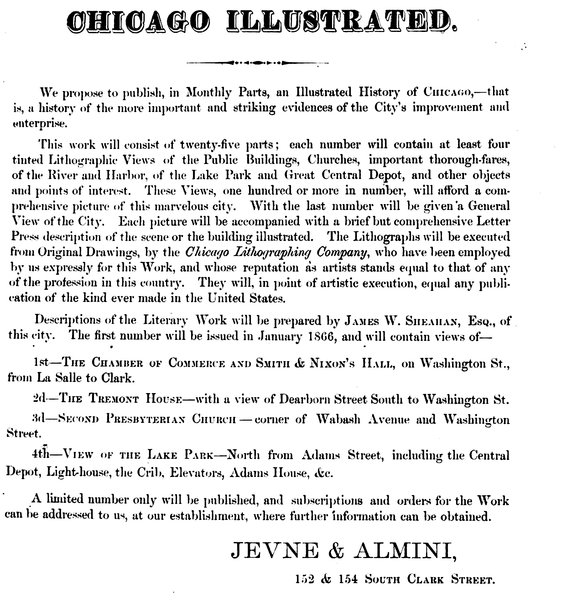 This work will consist of twenty-five part, each number will contain at least four tinted Lithographic Views of the Public Buildings, Churches, important thoroughfares, of the River and Harbor, of the Lake Park and Grand Central Depot, and other objects and points of interest. These Views, one hundred or more in number, will afford a comprehensive picture of this marvelous city. With the last number will be given a “General View of the City.” Each picture will be accompanied with a brief but comprehensive Letter Press description of the scene or the building illustrated. The Lithographs will be executed from Original Drawings, by the Chicago Lithographing Company, who have been employed by us expressly for this Work, and whose reputation as artists stands equal to that of any of the profession in this country. They will, in point of artistic execution, equal any publication of the kind ever made in the United States.