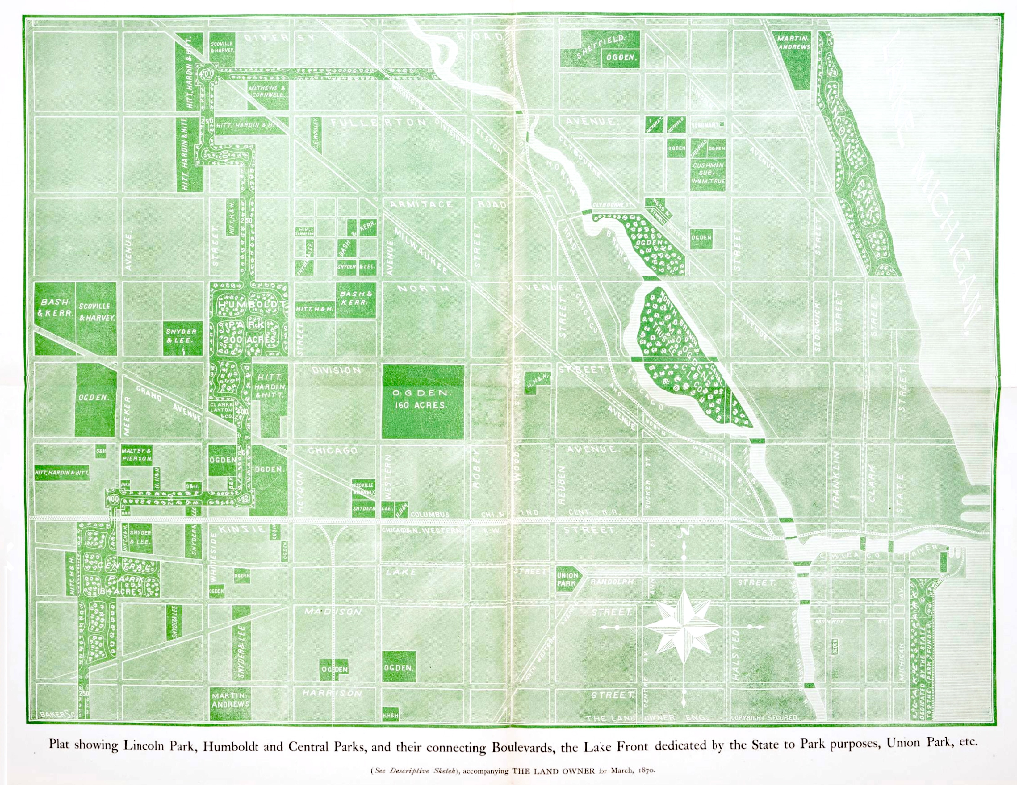 comprising a tract of sixteen hundred acres, including the well-known Riverside Farm, located on the Desplaines River, about six miles, in a southwesterly direction, from the city. Riverside is intended for a resident park. The entire territory within its limits will be interspersed with walks and drives, groves, arbors, fountains, &c. The river will be formed into innumerable artificial lakes, and the stream will be crossed at a score or more of places by fancy bridges. The ornamentation of the grounds is in the hands of the architects of Central and Prospect Parks of New York and Brooklyn, Messrs. Olmsted, Vaux & Co., which is a guarantee that it will be well performed. Mr. Olmsted is very enthusiastic in furthering the plan, and says that Riverside has as fine natural advantages as any grounds in the world. The park will be connected with the city by the finest drive in the West. It will probably be opened from Union Park, and run in a direct line, by what is now known as the Northwestern Plank Road, to the Desplaines River. It is further proposed to connect the drive with Twelfth and perhaps Twenty-second street. Over one hundred workmen have been engaged during the past month in building the foundations for the road, and three miles of ditching and grading will be completed by the 20th inst. The drive will be ornamented with five rows of trees, dividing it into carriage and wagon roads, riding paths, &c. An artesian well is how being sunk on the grounds, that is intended to furnish the residents of the park with water. A fifty thousand dollar hotel will be finished in the spring, and a dozen villas, at a cost or $10,000 each, are now being constructed. Olmsted will take especial pride in bringing all his genius to bear in the embellishment of this park. It is his first undertaking of the kind in the West, and, if a success, will prove a great recommendations for designing future projects. If the proposed parks in Lake and Hyde Park towns ever become realities, it is proposed to connect them by drives with Riverside Park. The Burlington & Quincy Railway runs through the centre of the grounds, and the hotel is being erected near the track, where a depot will shortly be established. The Chief Engineer of Prospect Park, Brooklyn is retained for Riverside, and has been at work over a month in executing the designs of the projectors and architects. He has with him twelve of his most expert assistants. This park, although a private enterprise, will, no doubt, prove of incalculable benefit to Chicago, people need breathing places, and they don’t care much how they are procured. But, private enterprise as it is, it is being carried out on a grand scale, and probably no less than half a million dollars will be expended in its improvement.