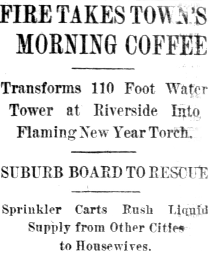 Riverside residents New Year resolutions were jolted at the outset. Just at the break of the first day of 1913 the 110 foot water tower, sole source of supply for the town, burned to the ground.