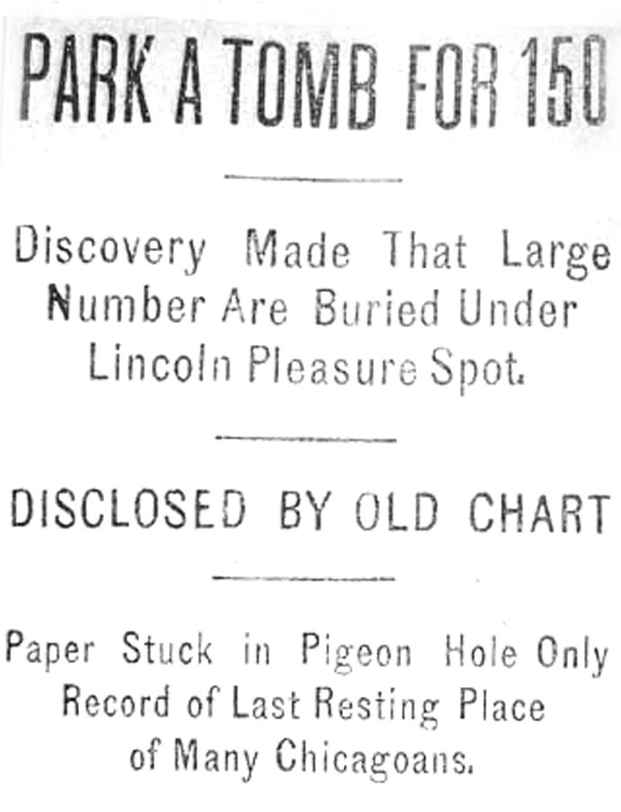1 Ten years after the establishment of Lincoln Park, four years after the Chicago Fire, and at a time when the disinterments were presumed to have been completed, there remained cemetery headstones in Lincoln Park, marking graves of individuals who had not been claimed for reinterment elsewhere. Wanting to complete the transition of the cemetery into the park grounds, the Lincoln Park Commissioners moved the scattered marked graves to a separate fenced location within the park. A few years later that Cemetery in the Park was itself incorporated into the park grounds by removing the above-ground evidence. Twenty years later, a park engineer discovered a map detailing the burials from that area. By that time nobody seemed to remember this earlier park feature.