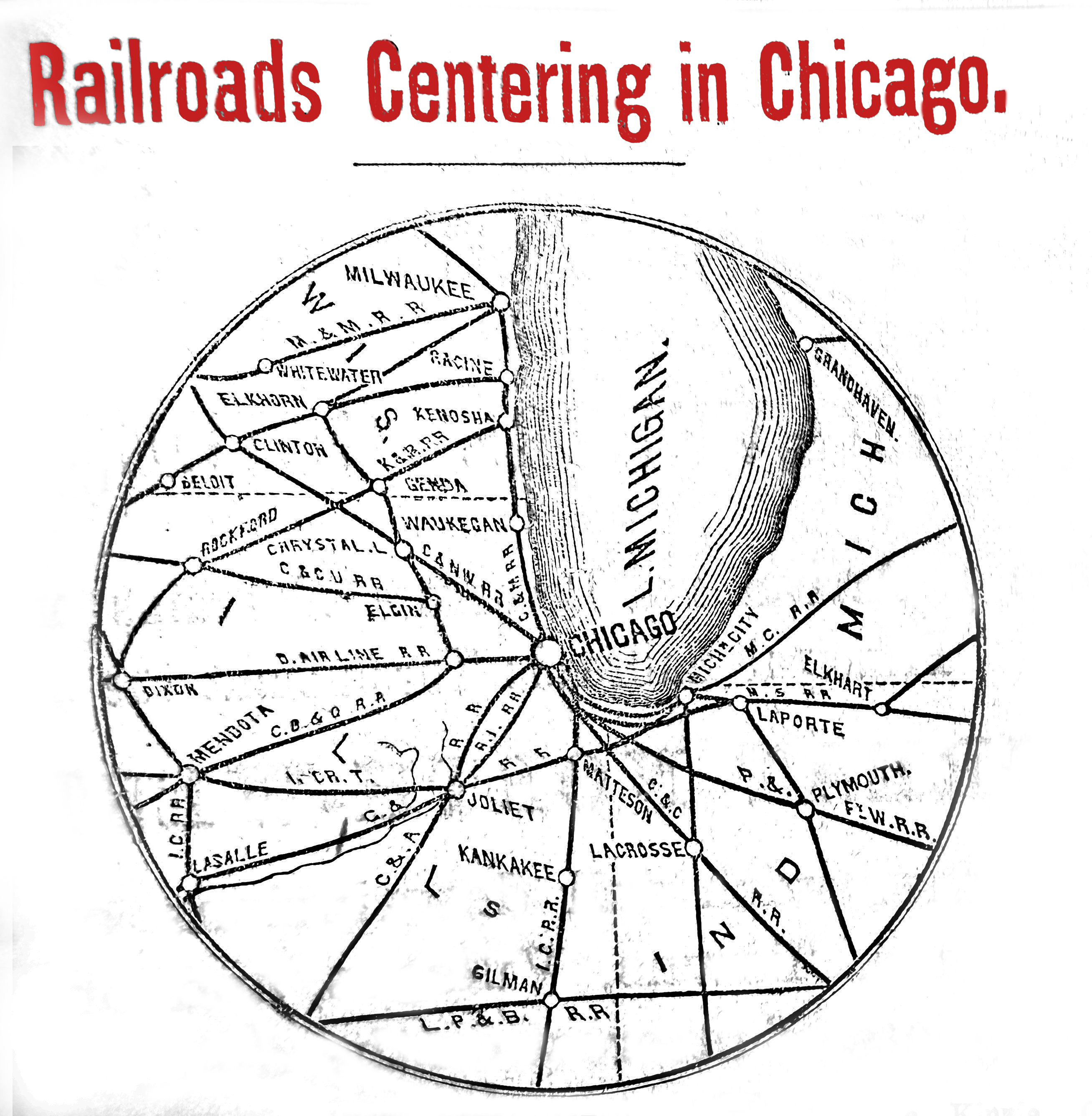 The Chicago and Milwaukee Railroad was built by two separate corporations, one chartered by the Legislature of Illinois, and the other by the Legislature of Wisconsin. The line of this road was first opened for the transaction of business between Chicago and Milwaukee, a distance of eighty-five miles, in June 1855. Depot, corner of Canal and West Kinzie streets.④