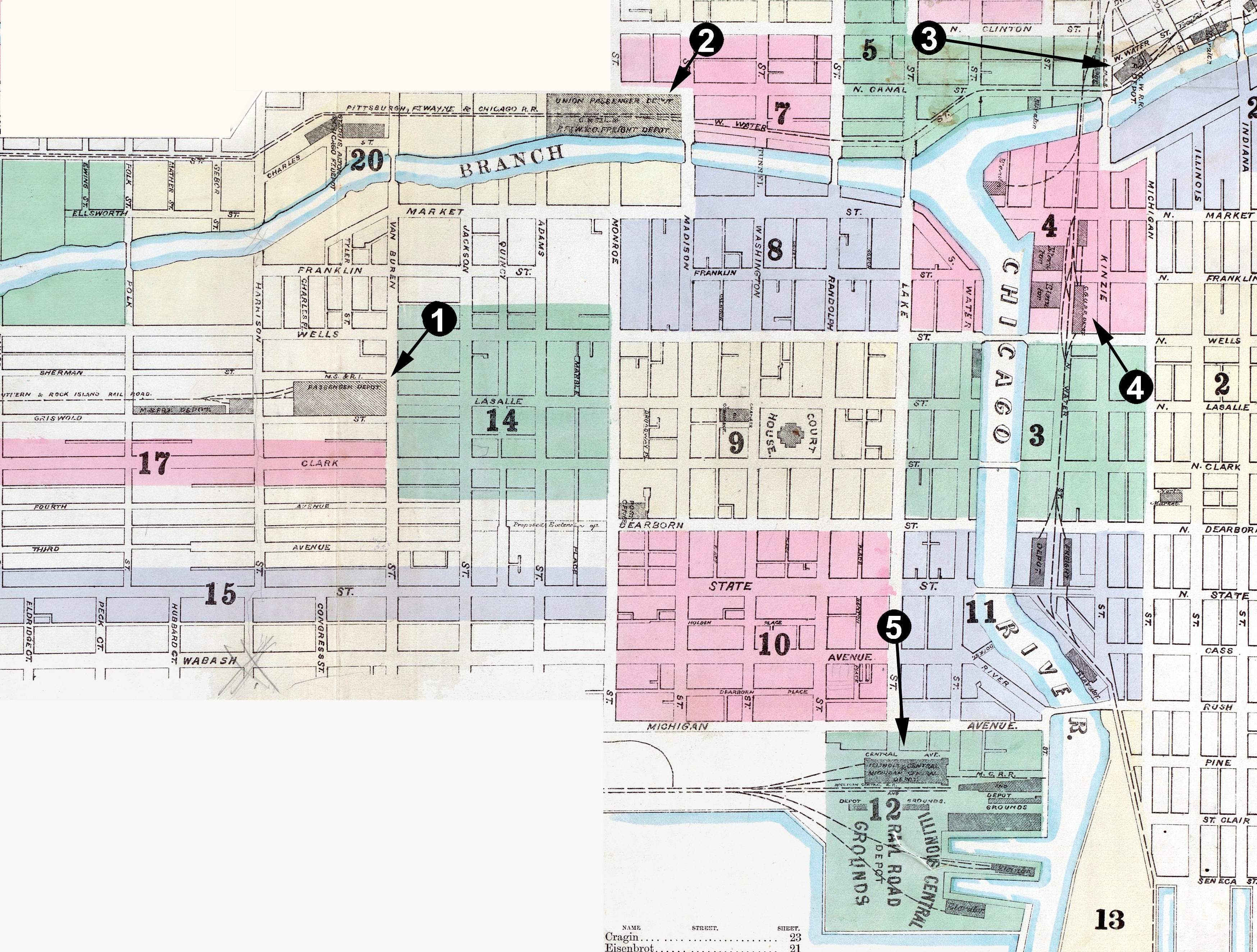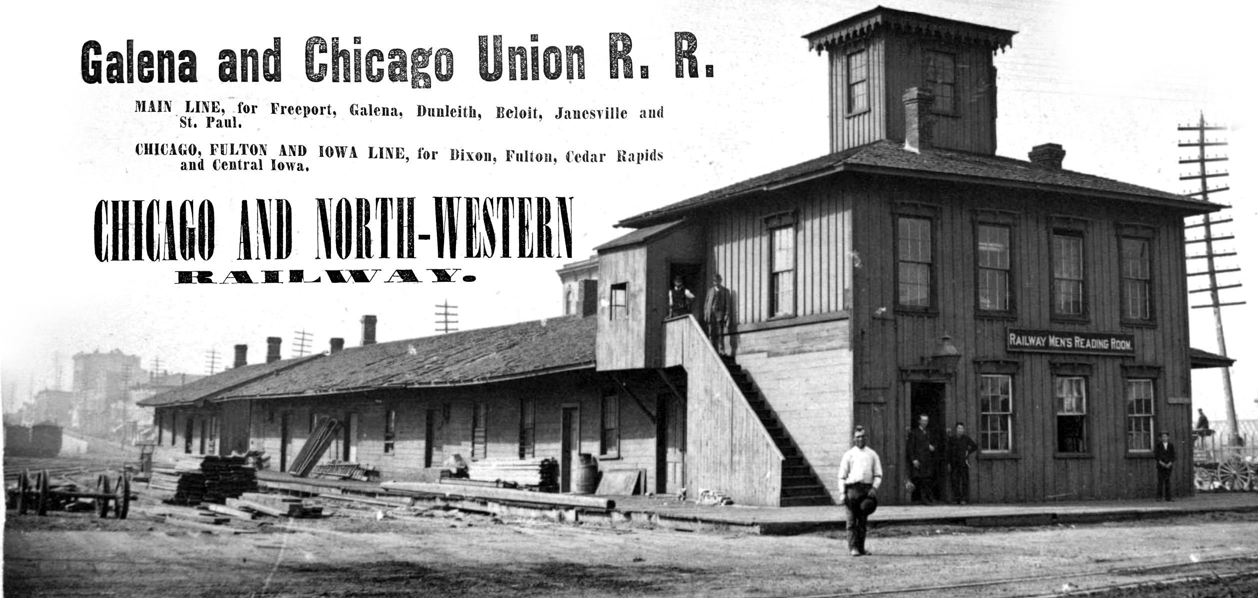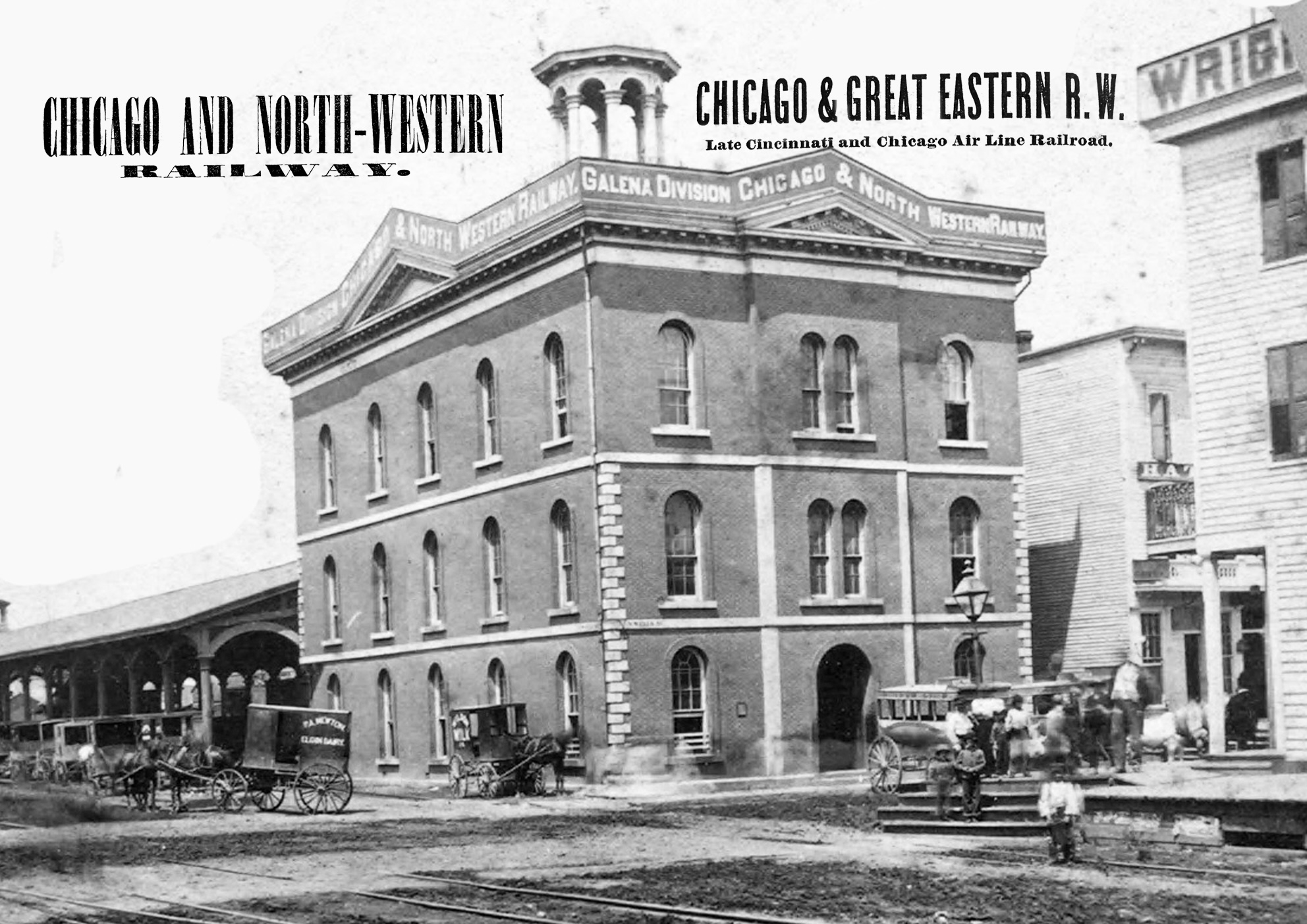 The first railroad opened out of Chicago, was the Galena and Chicago Union Railroad, now the Galena Division of the Chicago and Northwestern Railway. In 1848, the first portion of the road was completed, and on the 15th of December of that year, trains commenced running from Chicago to Desplaines River, a distance of ten miles. In April, 1849, the purchase of the locomotive Pioneer was formally announced to the directors, it having been received some time during the previous fall. It was the first locomotive ever brought west of Lake Michigan. The road was completed to Elgin, 41 miles, June 22, 1850. It was opened to Freeport, 121 miles from Chicago, September 1 , 1853. The total length of the road, including all its branches, is 490 miles. Depot, corner of North Wells and Kinzie streets.④