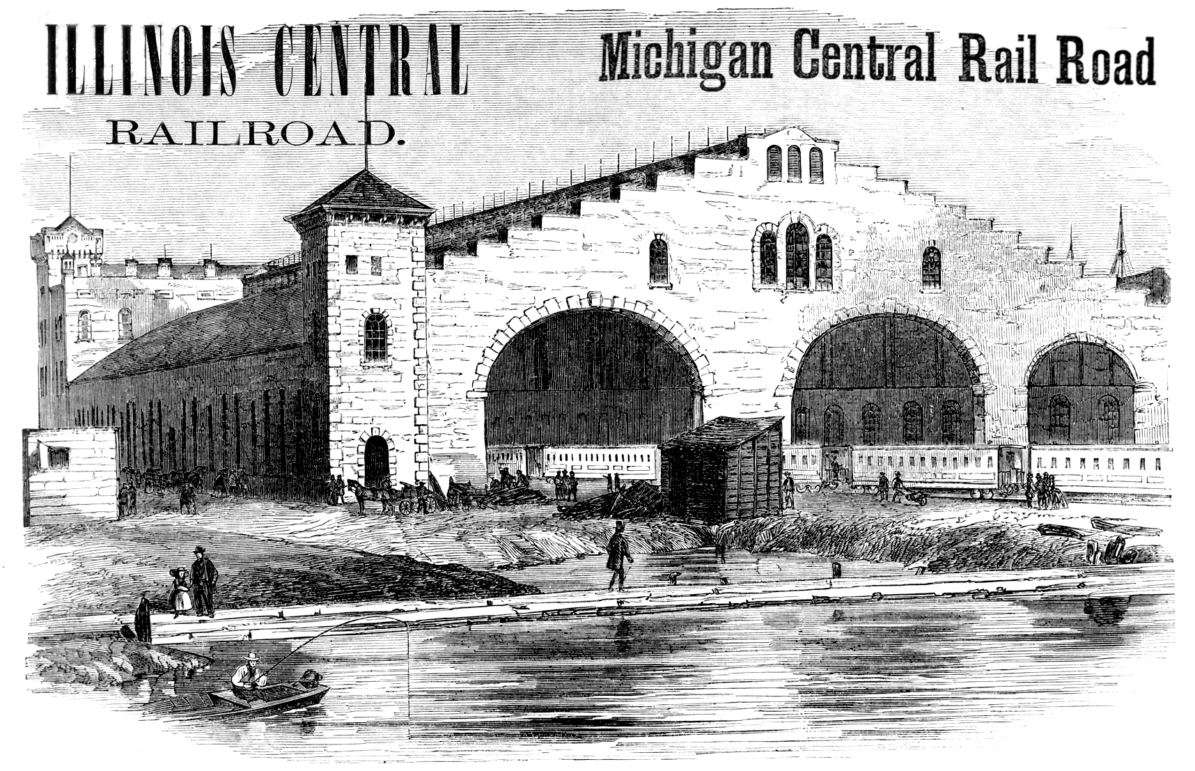 The Illinois Central Railroad running from Chicago to Cairo, and from Cairo to Galena and Dunleith, was commenced in June, 1851. The main line from Dunleith to Cairo was completed June 11, 1855. On September 27, 1856, the Chicago branch was completed, being the completion of the whole line, which is 704 miles in length. No railroad was ever pushed with greater vigor. The period intervening between the letting of the first contract and the laying of the last rail, was four years and three months. Depot, Central Depot, foot of Lake street. ⑤