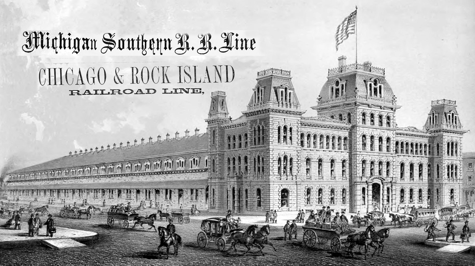 The Chicago and Rock Island Railroad, forming the most direct and reliable connection between Chicago and the Mississippi River, was completed to Rock Island, & distance of 182 miles, February 22, 1854. Depot, corner of Van Buren and Sherman streets. ①