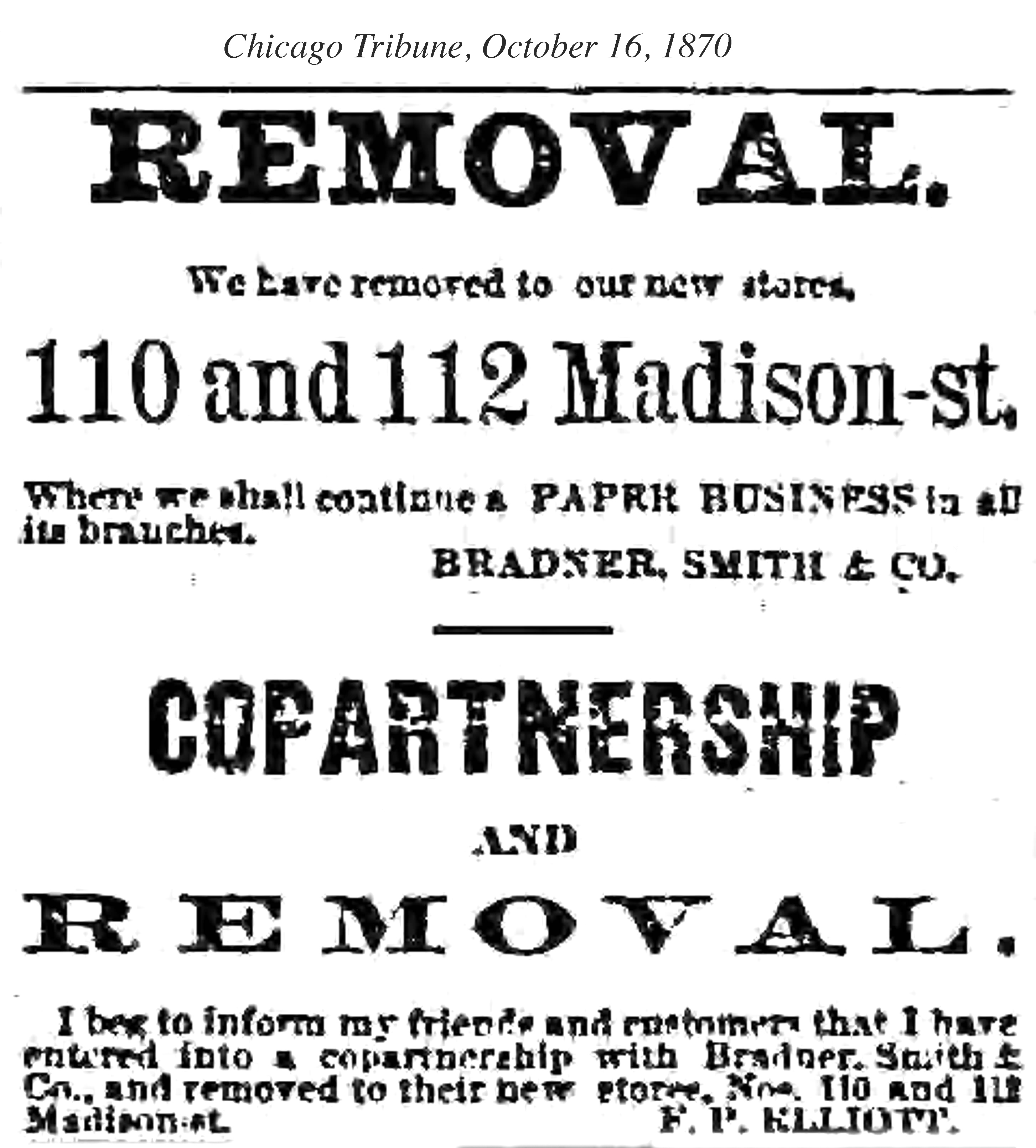 Bradner, Smith & Co. (J. B. Smith and F. P. Elliott), whol. paper dealers, 133 S. Water