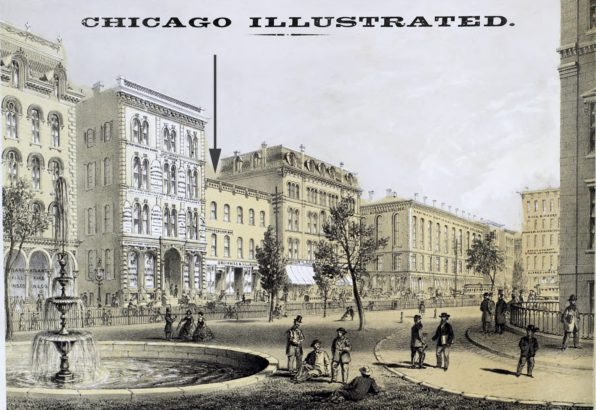 The building upon the north corner of the block is built of Milwaukee brick, with stone trimmings, and is owned by H. H. Magie, Esq. It is occupied by Insurance agents and others: the Lumberman’s Insurance Company having the principal offices on LaSalle street. The next building is mainly used by Grommes and Ullrich as wine vaults and warerooms. The Board of Education have rooms also in the upper part of the building.