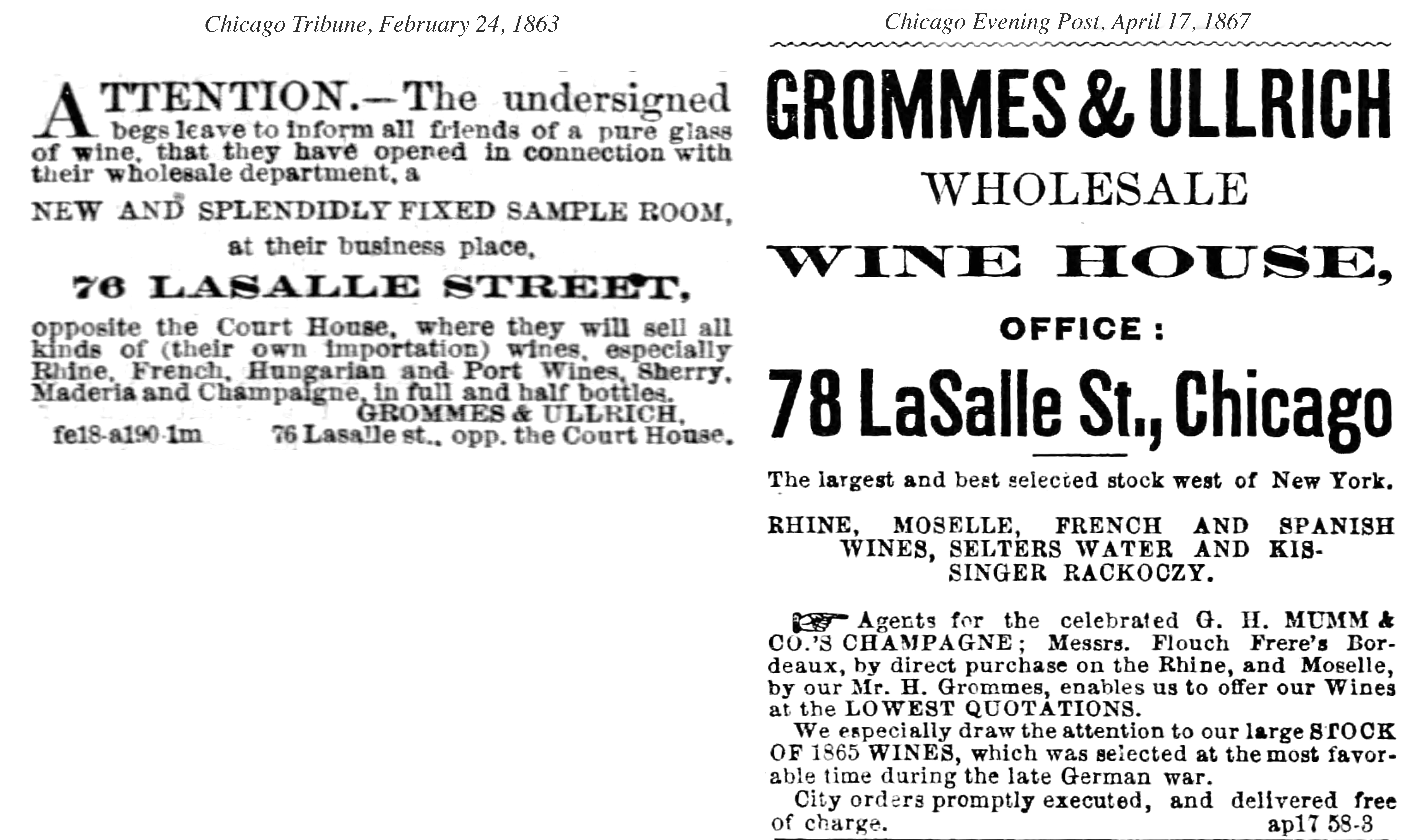 Grommes & Ulrich, (Hubert Grommes and Michael Ullrich,) wines and liquors, whol, 78 LaSalle.