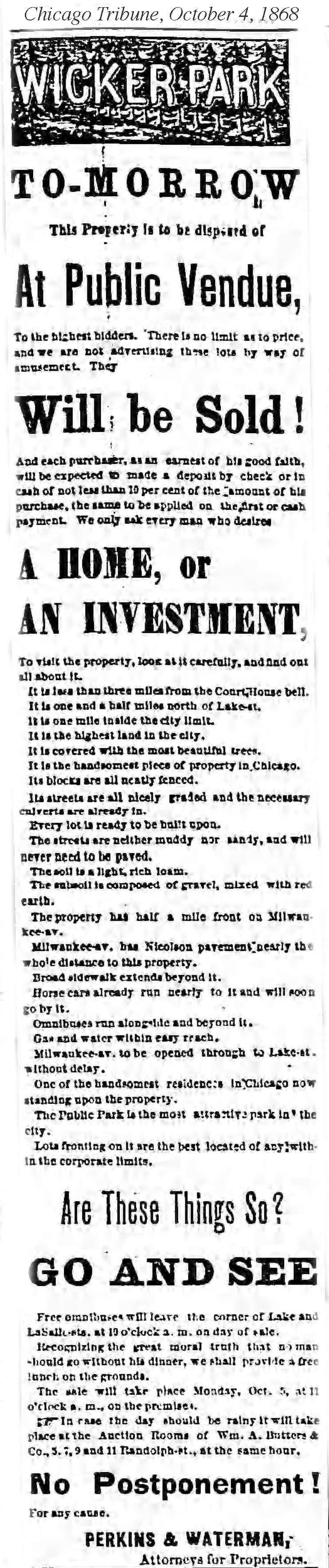 Mr. Wicker has dealt heavily in Chicago real estate, and has at different times owned some of the most valuable tracts in the city. He was the founder of Wicker Park, which he donated to the city. In 1848 he was married to Sarah Baldwin, of Montpelier, Vt. She died in 1852. In 1853 he married Elizabeth J. Sears, by whom seven children were born. Mr. Wicker was a prominent member of the Second Presbyterian but when the Olivet Presbyterian Church was founded he became a member of that organization.