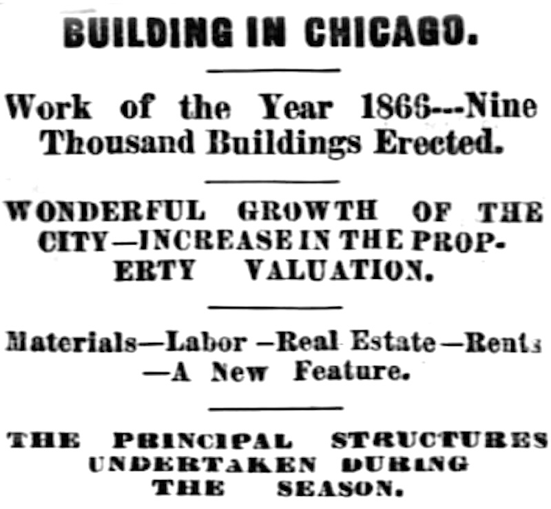 A though it would evidently be an utter impossibility to name any, considerable number of the thousands of buildings erected in the city during the past year, still a partial idea of the amount and nature of this wok may be gained from the books of the principal architects, and the following list will show some of the better class, of buildings, with their cost, location and general style. The list, bowever, it should be remembered, does not exhibit by any means the amount of work done by these architecte, and gives no des even of the comparative amount done by each. We have merely cited such works as would best suit the object of this summary, omitting nearly all buildings which cost less than $10,000. This class would probably include eight-tenths of the whole number built. Our architects, also, have all had more or less work out of the city—some doing the most of their business for this and other places in adjoining States. One has designed for other places twenty-six churches, costing from $5,000 to $125,000 each. Two others have executed designs for the country to the value of $200,000 each, and another $240,000. One has plans amounting to $100,000, for Lafayette, Indiana . Some of the architects have not handed in a report. Then, too, by far the larger part of the buildings, especially of the cheaper class, are not designed by architects, but by the contractor or builder, who frequently is the owner himself, so that it is manifestly impossible to give anything like a complete list, even if it were desired. The examples given, with these facts considered, will be sufficient to convey a fair idea of the wonderful extent and permanent character of the growth of Chicago.