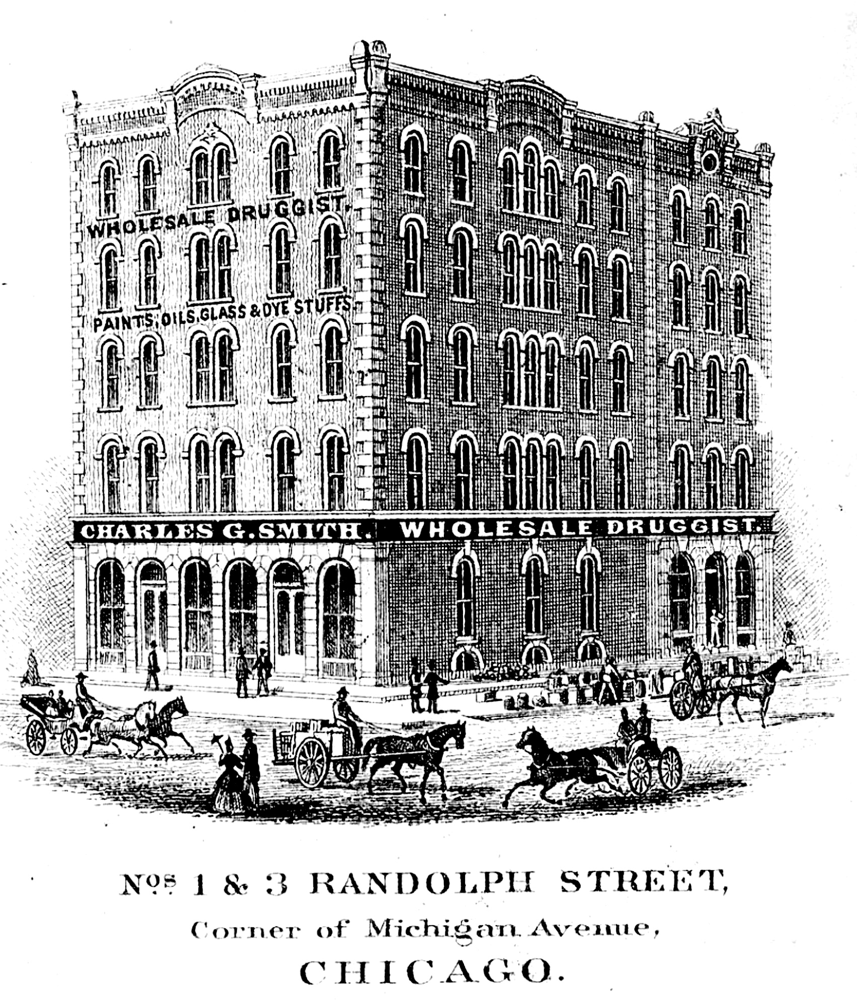 WHOLESALE DRUGS—REMOVAL.—Prominent among the many new business blocks erected daring the past gear in our city, is one covering lots one and three, Randolph street corner of Michigan Avenue, a large commodious structure, six stories in height, with liberal appropriations of vault room under the sidewalks, built for Charles G. Smith, the well-known Wholesale Druggist, and within the past few days filled by him from cellar to roof with one of the most exteneive and complete stocks ever offered to the trade: comprising everything, substantial, aolid and fanciful, ever called for by the apothecary, and all of the very best brand. The new building has been erected and fitted with reference to the requirements of the trade, giving separate storage and proper preservation to each one of the vast array of goods, and admitting of their speedy selection and carefal packing in the filling of bills.