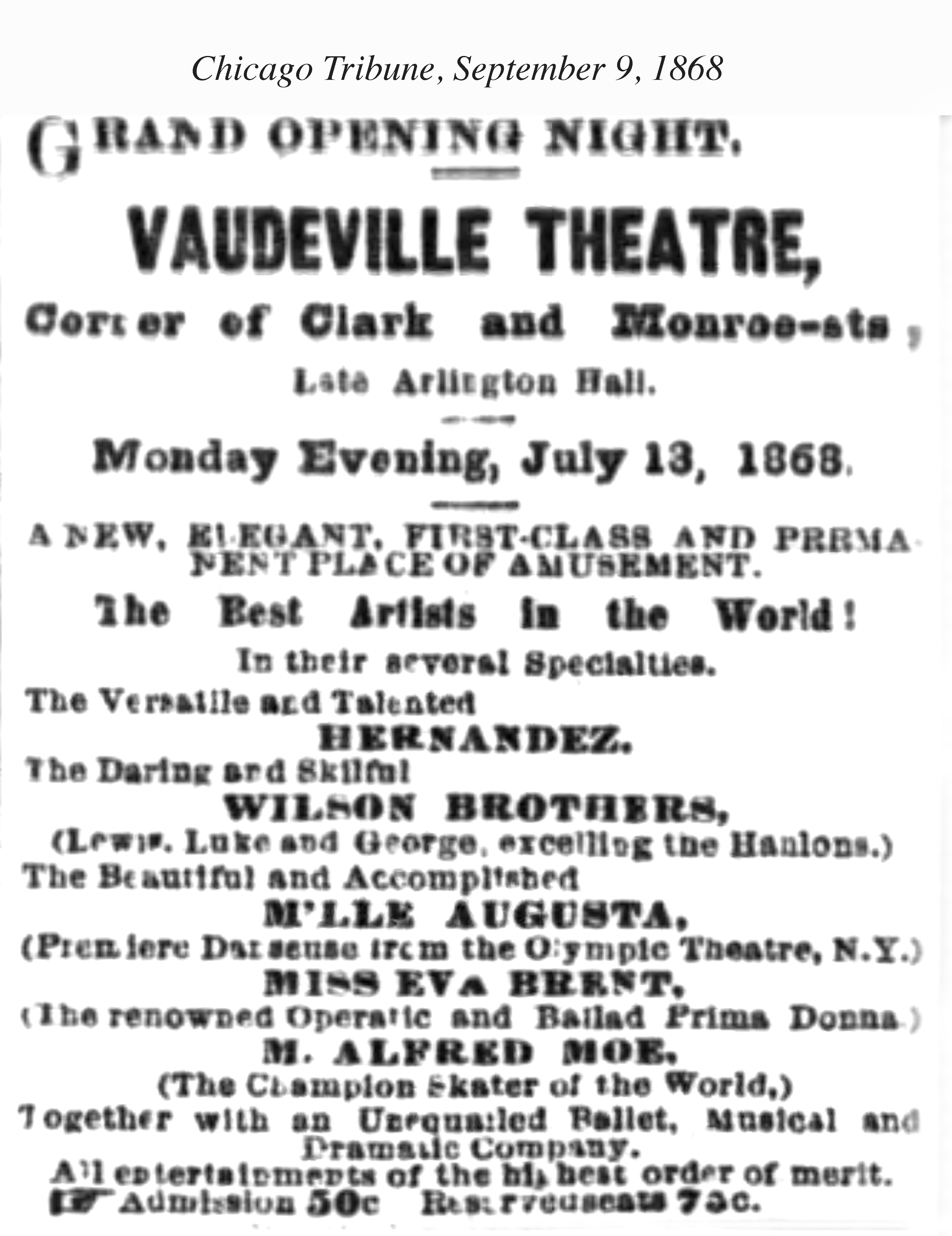 VAUDEVILLE THEATRE.—On Wednesday evening next, the experiment of a genuine Vaudeville theatre will be tried in this city, at the Arlington Hall, corner of Clark and Monroe streets. The performers engaged are all of excellent calibre, embracing among others the Wilson brothers, who can hardly be excelled in acrobatic or flying business; Miss Brent, an excellent ballad singe: Hernandez, who is too well known here for any detailed mention, and several first class danseuses. There will be a regular vaudeville each evening, and mixed entertainment also. A vaudeville theatre properly conducted ought to, and undoubtedly will, prove a success.