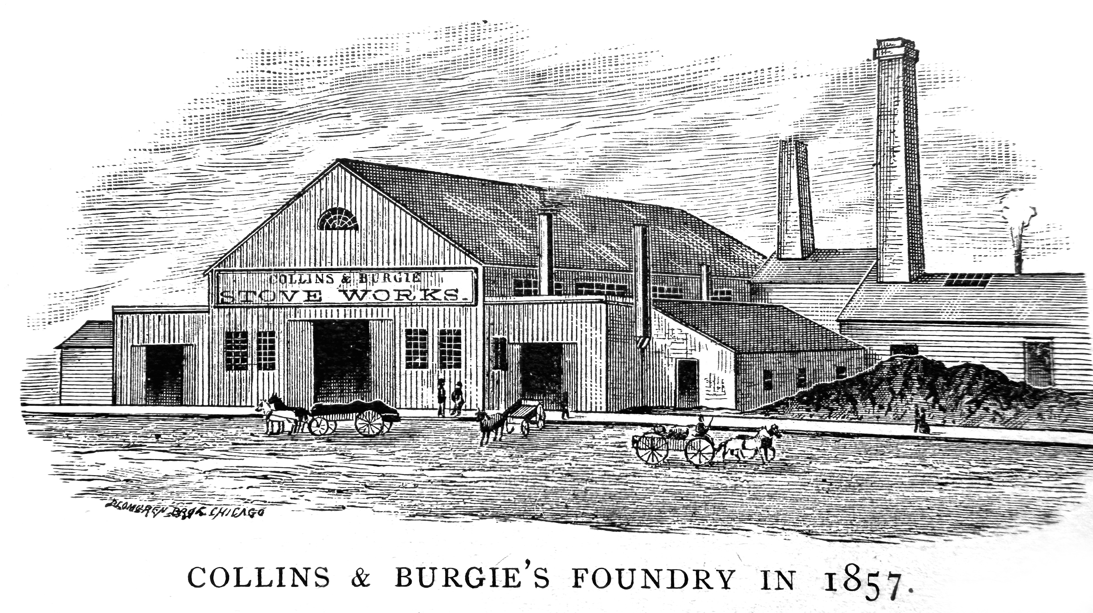 Collins & Burgie.—In the first volume of this work mention has been made of the first stove-foundry established in this city, in 1846, by C. R. Vandercook. It was known as the Phoenix foundry, and was located on the north side of the river, just east of the present site of Kirk’s soap works. The firm made a specialty of manufacturing “Queen of the Prairies,” a new hot-air cooking stove, and also turned out furnaces, grates, etc. This was the first stove foundry in Chicago. For several years Joshua R. Shedd was associated with Mr. Vandercook, who is authority for the statement that during the time he was connected with the works, they employed two hundred men, and turned out fifty stoves a day. In 1852, the ownership of the foundry passed into the hands of Howard Sherman, Joshua R. Shedd and Dr. John H. Foster, who, under the firm name of Sherman, Shedd & Foster, conducted the business until 1857, when James L. Collins, and Henry C. Burgie became the proprietors, and have so continued to the present time. In 1854, the foundry had been moved from its location on the North Pier to the southwest corner of Van Buren and Jefferson streets. The accompanying illustration, engraved from a print furnished by the present proprietors, shows the works as they appeared in 1857. These buildings were erected by Sherman, Shedd & Foster in 1854, when the removal already mentioned was made. There Collins & Burgie employed in the early part of their history about seventy-five men, and melted about twelve hundred tons of iron annually. As the business grew, they enlarged their works, and in 1872 erected their present foundry and warehouse, covering an area of nearly two acres. They now employ three hundred men, and manufacture three thousand tons of stoves annually. During 1883, they made fifteen thousand stoves, varying in weight from fifty to seven hundred pounds. Up to 1873, they did other iron casting, but since then stoves, including heating and cooking ranges, have been their exclusive line of manufacture. A hay-burning stove is also manufactured by this firm, and is one of the very few of this kind that have been successfully made. It was patented in 1878 by M. L. Wood, and has since been much improved.