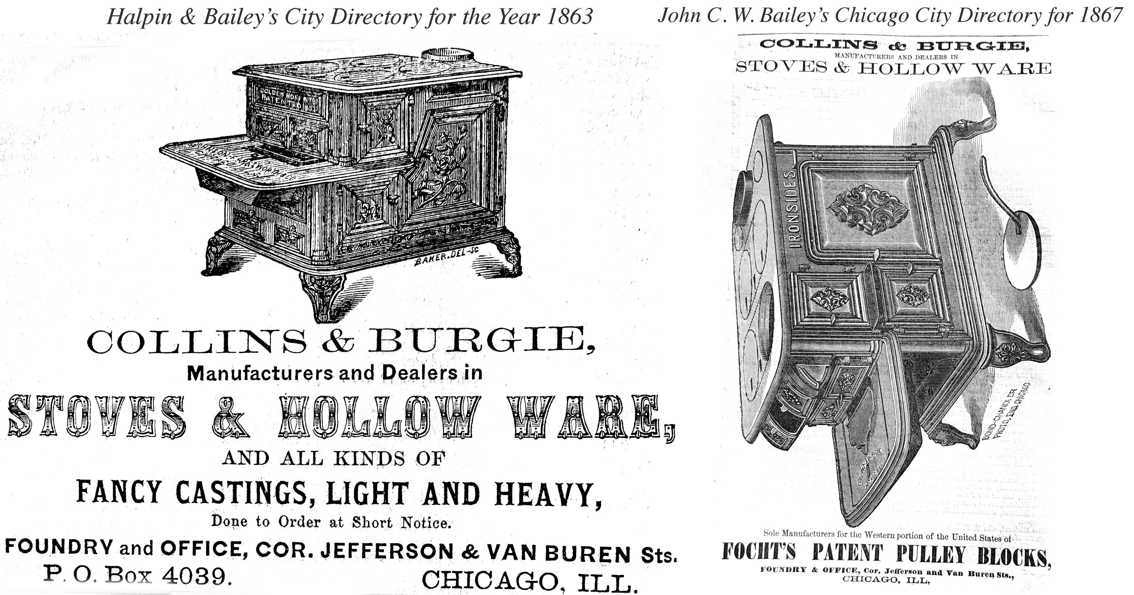 Collins & Burgie, stove and hollowware mnfrs. and iron founders, Jefferson, sw. cor. W. Van Buren.