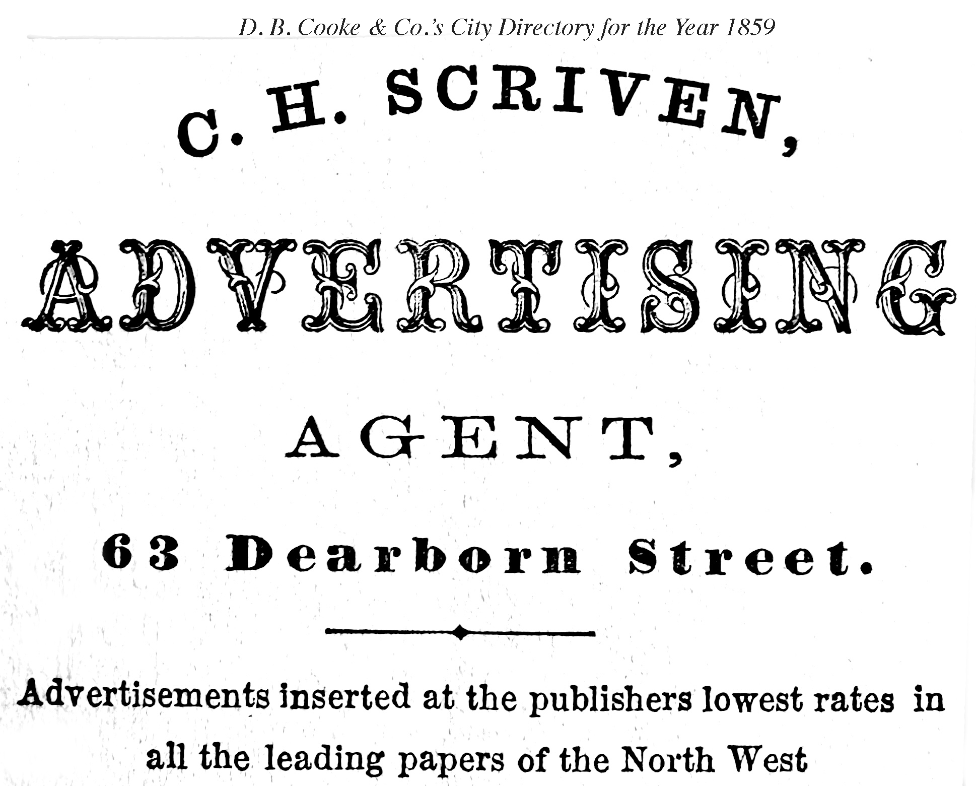 The attention of our business men called to the facilities afforded through C. H. Scriven’s Agency, 65 Dearborn street, for advertising in the leading newspapers of the West and Northwest in the most efficient and economical manner, at publishers lowest prices. Read the many favorable notices lately received from the Press of Chicago and the Northwest, with all of whom in the city, and with many of the leading journals in the Northwest, Mr. Serien has had business relations, the result of which have been as honorable to himself as satisfactory to both classes of his patrons, the advertisers and the publishers.