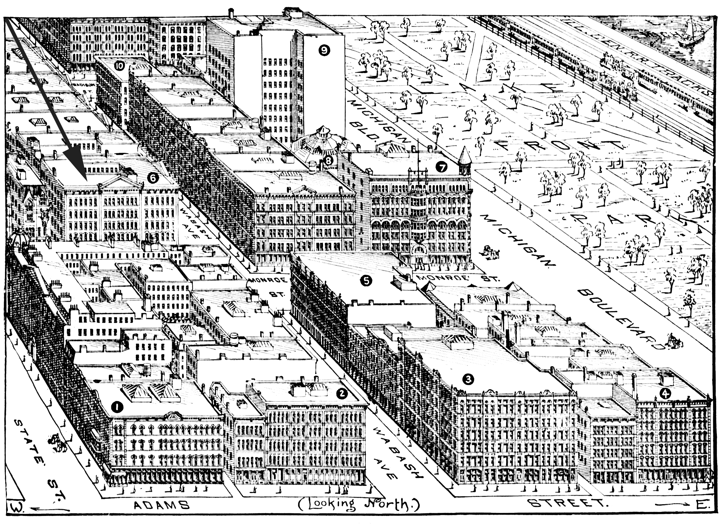 The Windsor-Clifton Hotel, at the northwest corner of Wabash Avenue and Monroe Street, was built in 1872 and razed in 1927 to make way for the Men’s Store of Carson, Pirie, Scott & Company. For many years it was one of Chicago’s leading hotels. The old Chicago Club, afterwards De Jonghe’s Hotel and Restaurant, is seen west of the Windsor-Clifton. It was originally called the Clifton House till 1909 when it was purchased by Samuel Gregsten (Windsor European).