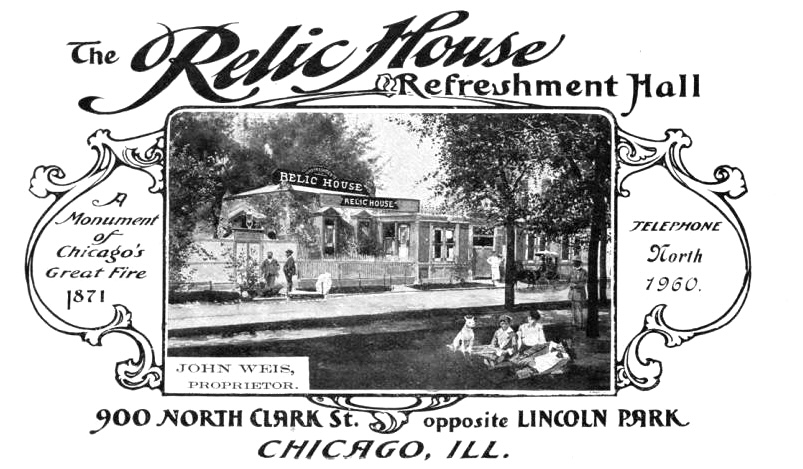 The most and ornamental monu-ment of the fire is the “Relic House,” well known to North-Siders and Lincoln Park visitors. In 1872, when the “leavings” of the fire could be had for the asking or the trouble of picking them up, a man named Rettig conceived the idea of building a small cottage out of such material as a melted mixture of stone, iron, and other metals. The queer structure was built at North Park avenue and Center street. Ten years ago it was removed to its present site near the junction of Clark street and North Park avenue, Philip Vinter becoming the proprietor. Four years afterwards the “Relic House” passed into the hands of its present owner, William Lindemann, who has added a refreshment parlor to the saloon and made quite a rustic spot out of the relic.