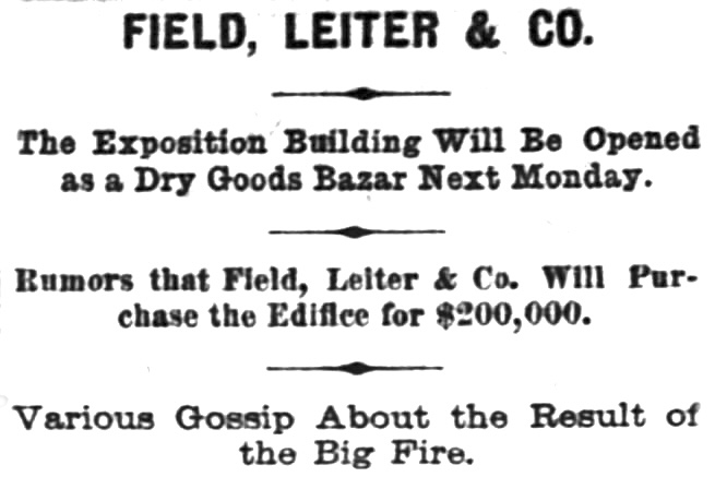 The work of putting a stock of goods into the Exposition Building was begun early yesterday morning, and so rapidly was it carried on that Messrs. Field & Leiter will beready offer customers this morning everything that could be obtained at their old store. Visitors to the new establishment will be astonished at the transformation wrought in a little over a week in the structure at the foot of Adams street. Only about two-thirds of it is really occupied by the firm, the extreme southern portion being cut off by a partition, as is also a strip of about 150 feet at the north end. The space used for displaying goods is about 600 feet long and 200 wide. All that north of the fountain is covered with shelves and counters, while that south is devoted to the suit department, carpets, etc. Taken as a whole, there isn’t a more convenient store in the country. The opening to-day will doubtless bring together a large crowd, if the weather isn’t too wretched.