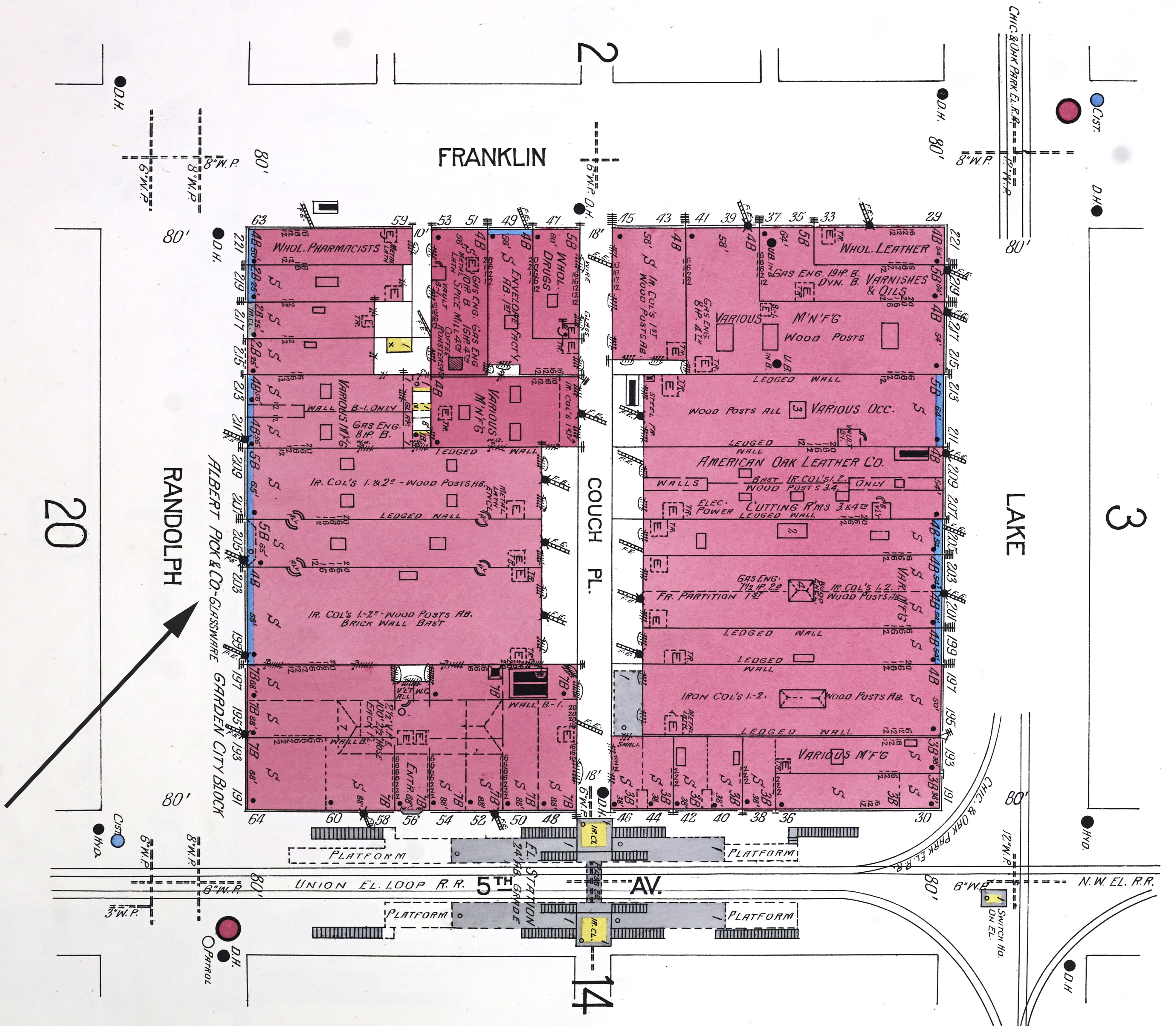 At 199-203 Randolph Street, was erected in 1872 for wholesale jobbers; 4 stories, 50 feet wide, 120 feet.