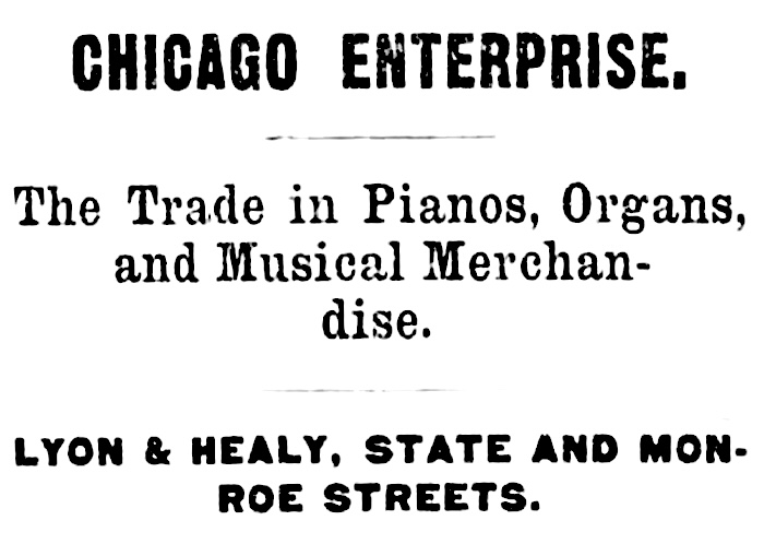 This enterprising house, one of the largest in the world, has been established in Chicago some 13 years, Mr. Lyon himself having been for a long period previously in the same business in Boston, where he introduced the world-famed Steinway pianos 22 years ago. By fair and honorable dealing and excellent management, their business has been worked up to mammoth proportions, having steadily increased from year to year. Their trade last season aggregated $550,000, and averages better this year than last, and they are from day to day selling goods in new territory, indicating the expansiveness of the trade centering in Chicago. While they have probably as large a retail patronage as any house in this line, they likewise transact a very heavy wholesale business in all sections of the great Northwest, considerably East, West to the Golden State, and are branching out in other directions.