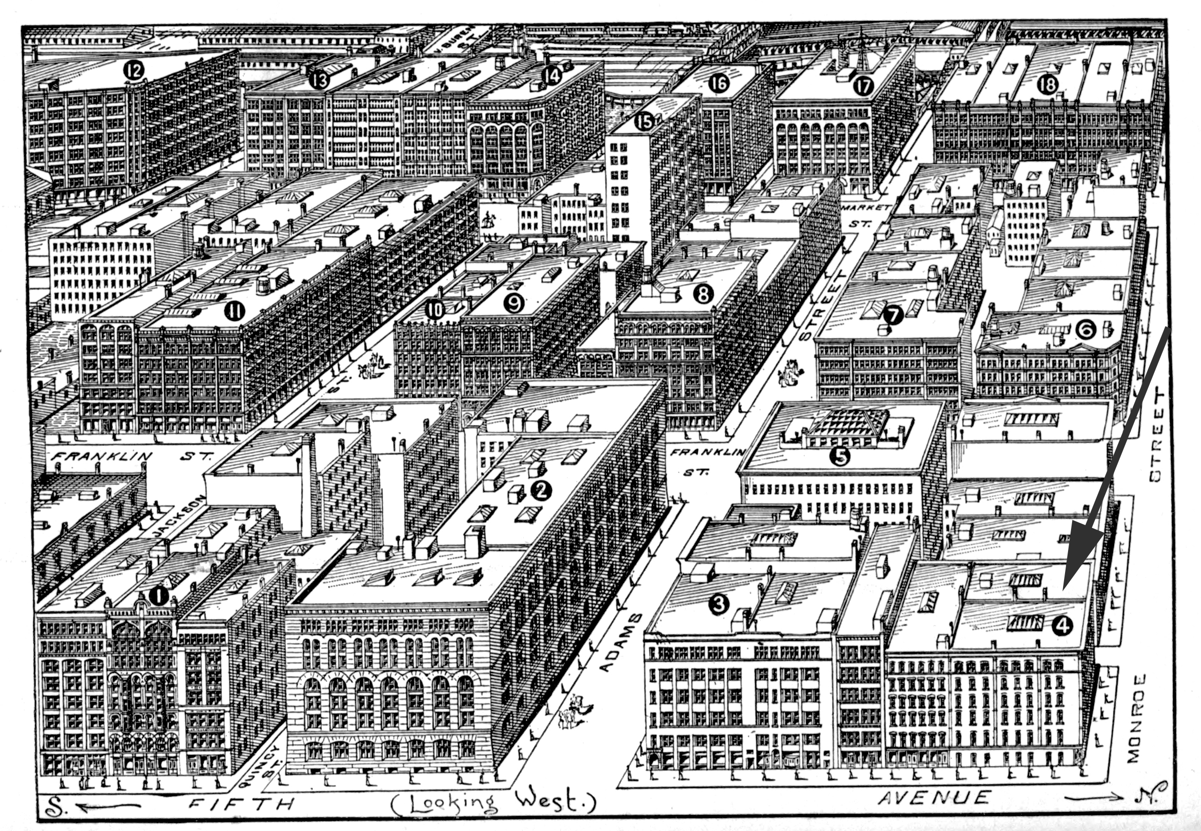 Fronts 180 feet on Fifth Avenue and 100 feet on Monroe Street, at the southwest corner. It is 95 feet high, with 6 stories and basement. There are 3 freight and 2 passenger elevators, brick and cut-stone exterior. The structure is occupied by wholesale jobbers of clothing and woolen goods. Erected in 1874.