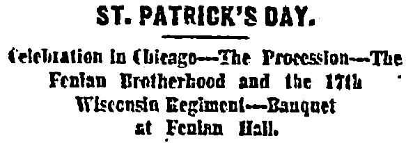 Contrary to general expectation and custom, St. Patrick’e Day was exempt from a cold water deluge, but, although there was no rain, a slight sprinkling of snow, which fell early in the morning, made the streets almost impassable with mud after the genial rays of the sun poured out upon it. About 9 o’clock in the morning the sky became overcast with thick, heavy clouds, through which the sun occasionally shone forth in sub-meridian splendor. The streets at an early hour were crowded with people—men, women, and children of all ages, sizes and colors. In the neighborhood of Market street the crowd was most dense, and, as the Catholic Total Abstinence Society came marching along, headed by the National Band, the spectators sprang up as it were by magic, and in a few minutes Market, from Lake to Madison was a living sea of humanity. In a a few minutes afterward along came the Hibernian and the United Sone of Erin Societies by brass bands, and after these came four companies of the Brigade—350 men under arms—under command of Colonel Michael Scanlan, and 200 members of the Fenian Brotherhood, all bearing the badge of membership—F. B. on a small green rosette, pinned to the cost breast.