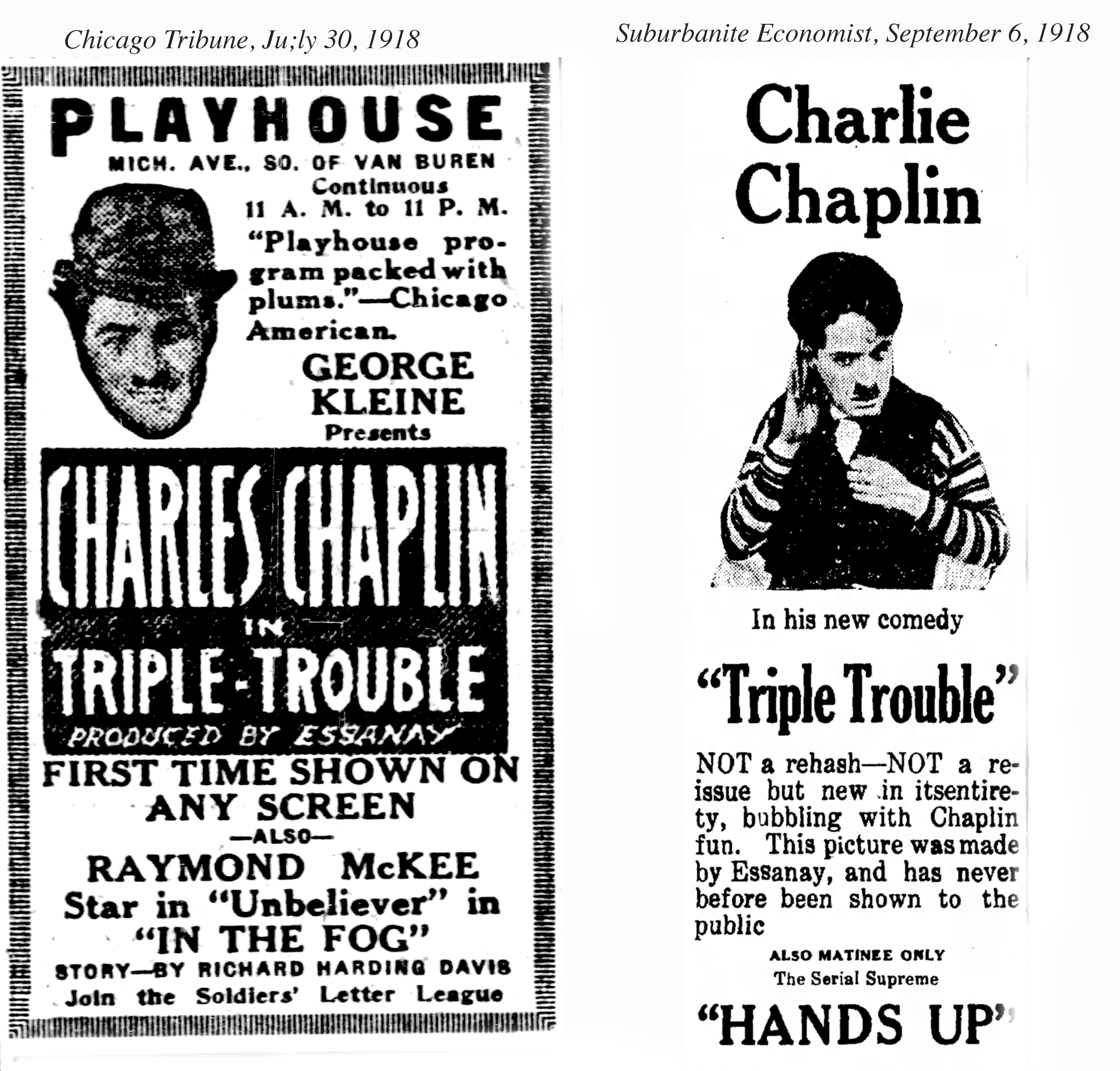 “Triple Trouble is not a new Chaplin picture, but the discarded portions of Police, which was the last pieture made by Charles Chaplin for Essanay Film company.”