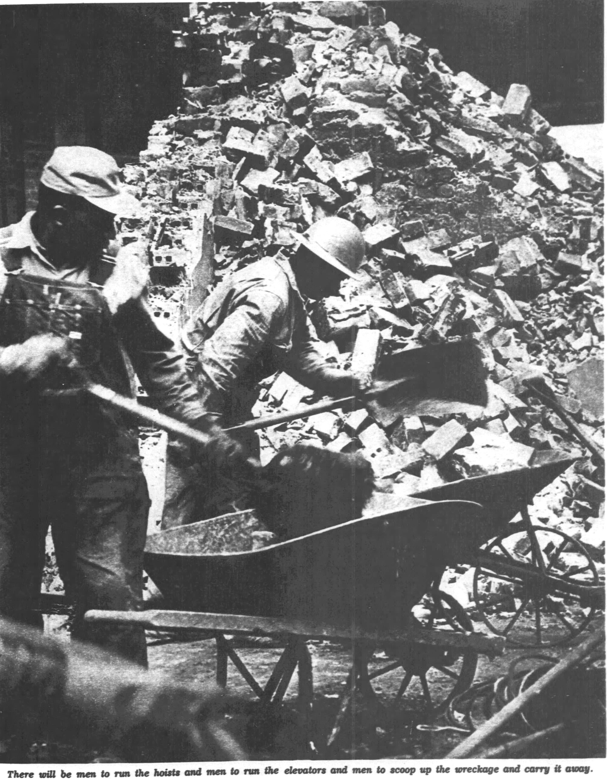 There will be men to run the hoists and men to run the elevators and men to scoop up the stray bits oi wreckage and carry them off in wheelbarrows, tho most of the debris will move to the chutes on a conveyor belt. Linking this vast array of destroyers will be both telephones and walkie-talkies to transmit voices from the fourth sub-basement, 30 feet below the water table, to the 46th floor, a distance of 701 feet.
