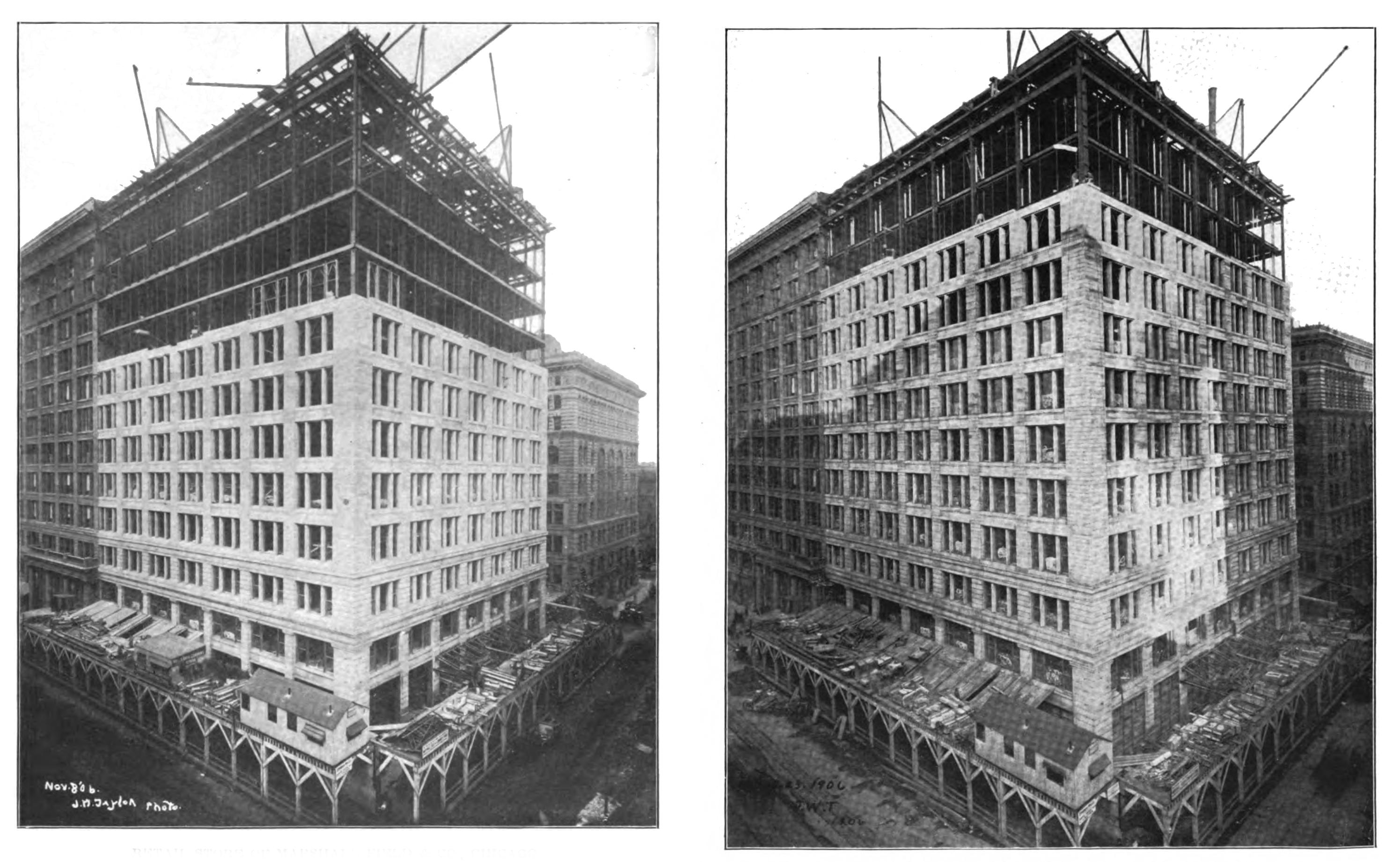 Right—Taken November 23, 1906. On December 17, 1906, this store was in use for selling goods on three floors, with display in three windows, while granite setting was still progressing.