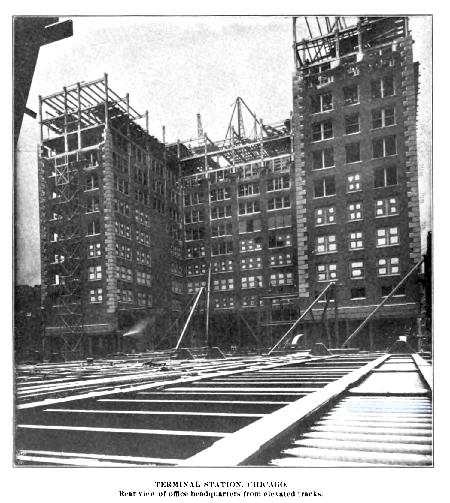 The train shed will be 578 ft. long and 210 ft. wide. The roof trusses will be a single arch, spanning the entire width of the shed. The tracks are to be elevated 16ft. above the street, and the train floor will be carried on steel plate girders resting on steel columns, spaced 30 ft. apart in the cab stand area, and 15 ft. elsewhere. The train shed foundations will rest upon piles; those for the columns supporting the train floor will be a spread foundation of concrete, having a depth of 14 ft. E. C. and R. M. Shankland, Civil Engineers, Chicago,have the steel work of the train shed and the foundation work in charge.