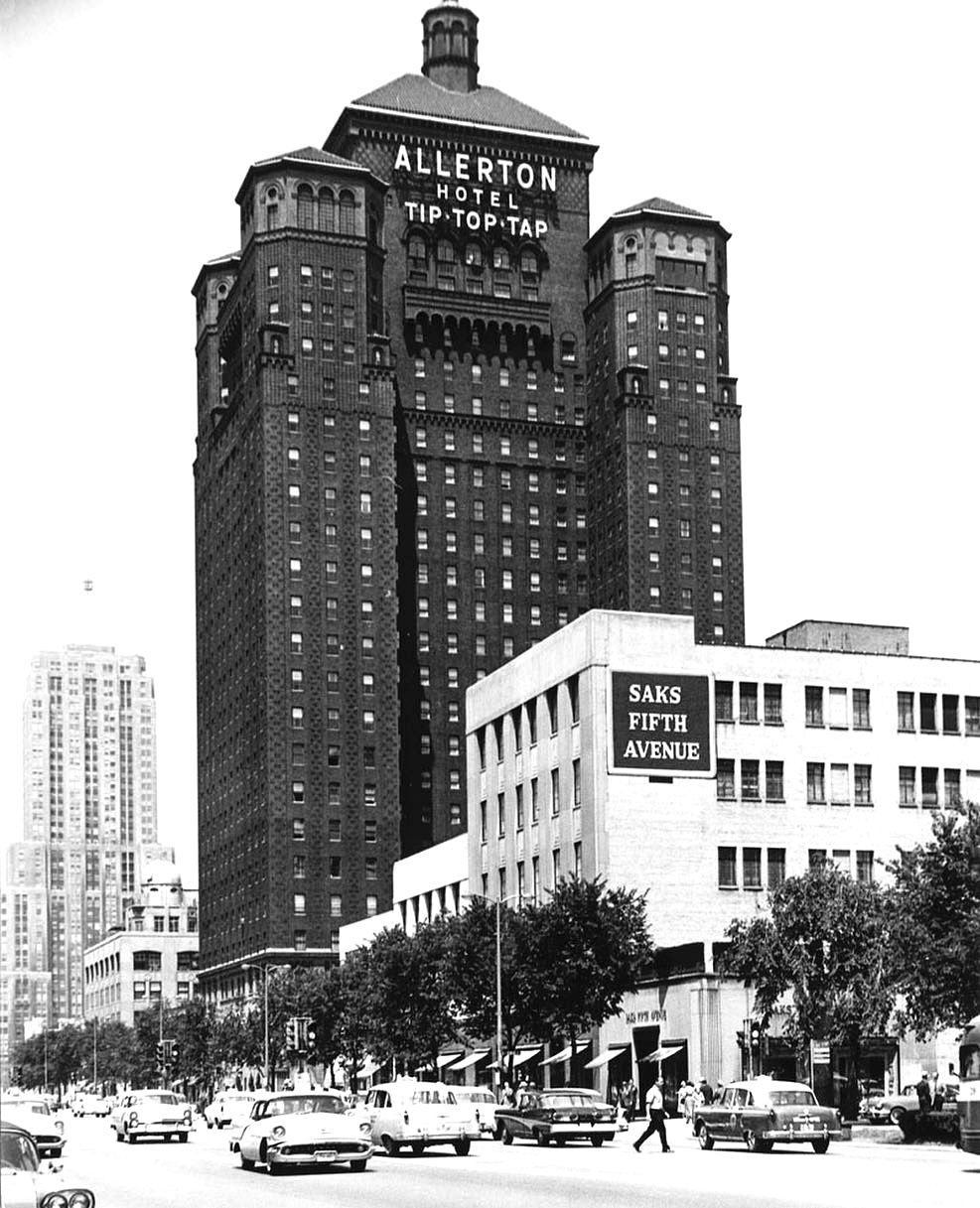 - 1950 evening view displaying the upper-story signs for the “Allerton Hotel” and the “Tip- Top-Tap” (installed 1928 and 1946, respectively).