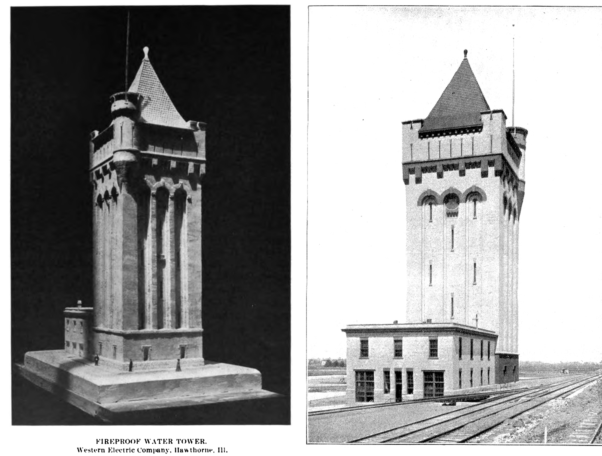 In the center of a group of ten buildings being erected from design by Samuel A. Treat, for the Western Electric Company of Chicago on their recent purchase near Hawthorne, Ill., will be erected a water tower, a model of which has been photographed for the purpose of illustration .