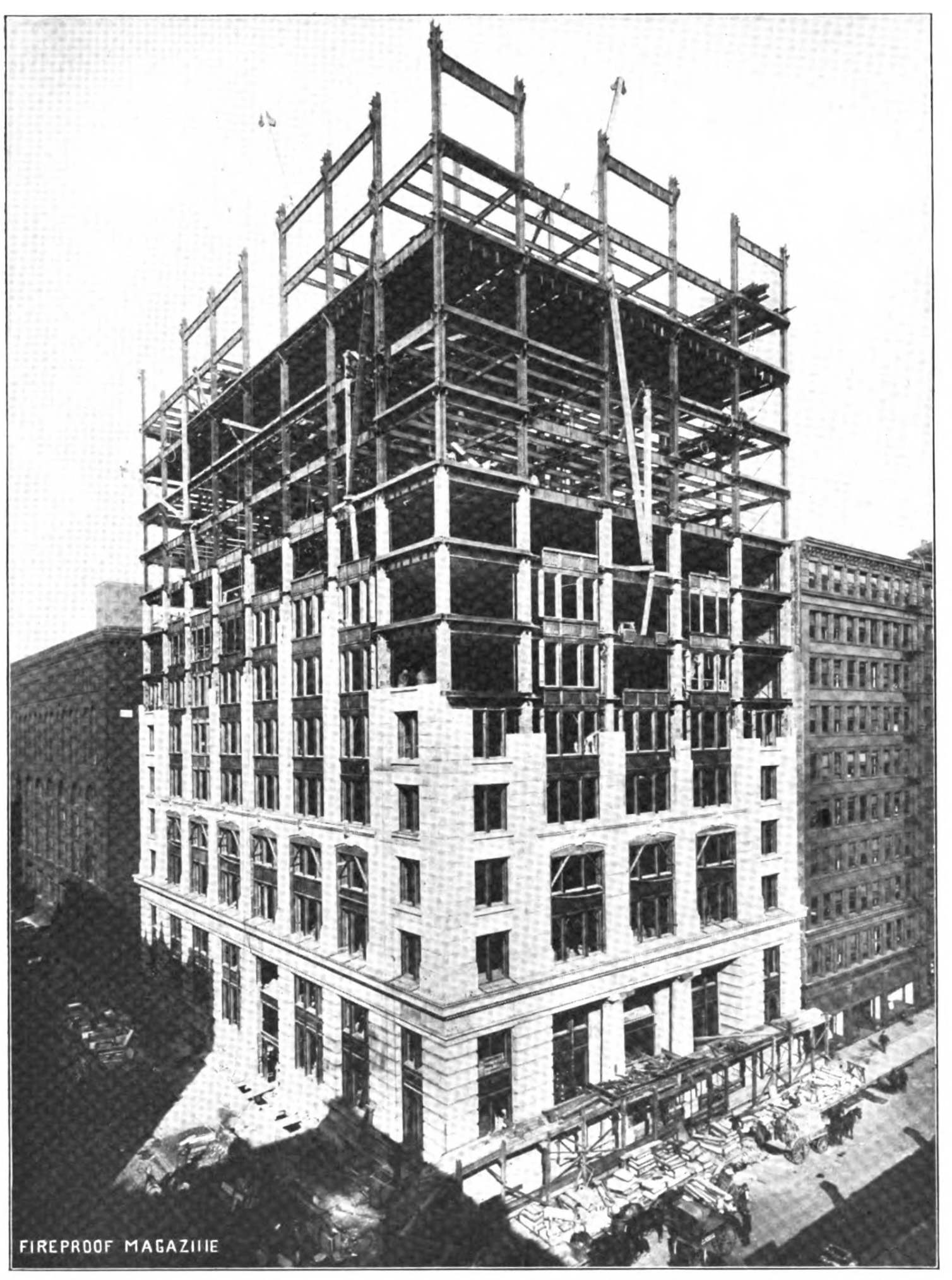 Frost & Granger are architects for the new office building of the Chicago and Northwestern Railway Company, which will occupy the entire building. It is located at the northeast corner of Jackson Boulevard and Franklin Street. The dimensions are 105 by 166 feet, and it will be fourteen stories high. The total height above grade will be 209 feet, and the depth below grade will be nine feet. The foundation consists of fifty concrete piers, carried down in wells ninety feet below datum to natural rock. The system of fireproofing for the floors is flat end pressure hollow tile arches between 1 beams. All constructive work is firepoofed with the same.