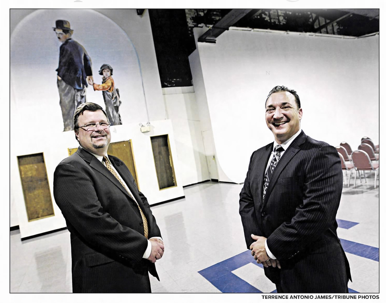 - St. Augustine College President Andrew Sund, left, and project developer Gary Keller stand in a building once part of the Essanay Studio complex that’s slated for remodeling. The mural shows Charlie Chaplin, who did some work there.