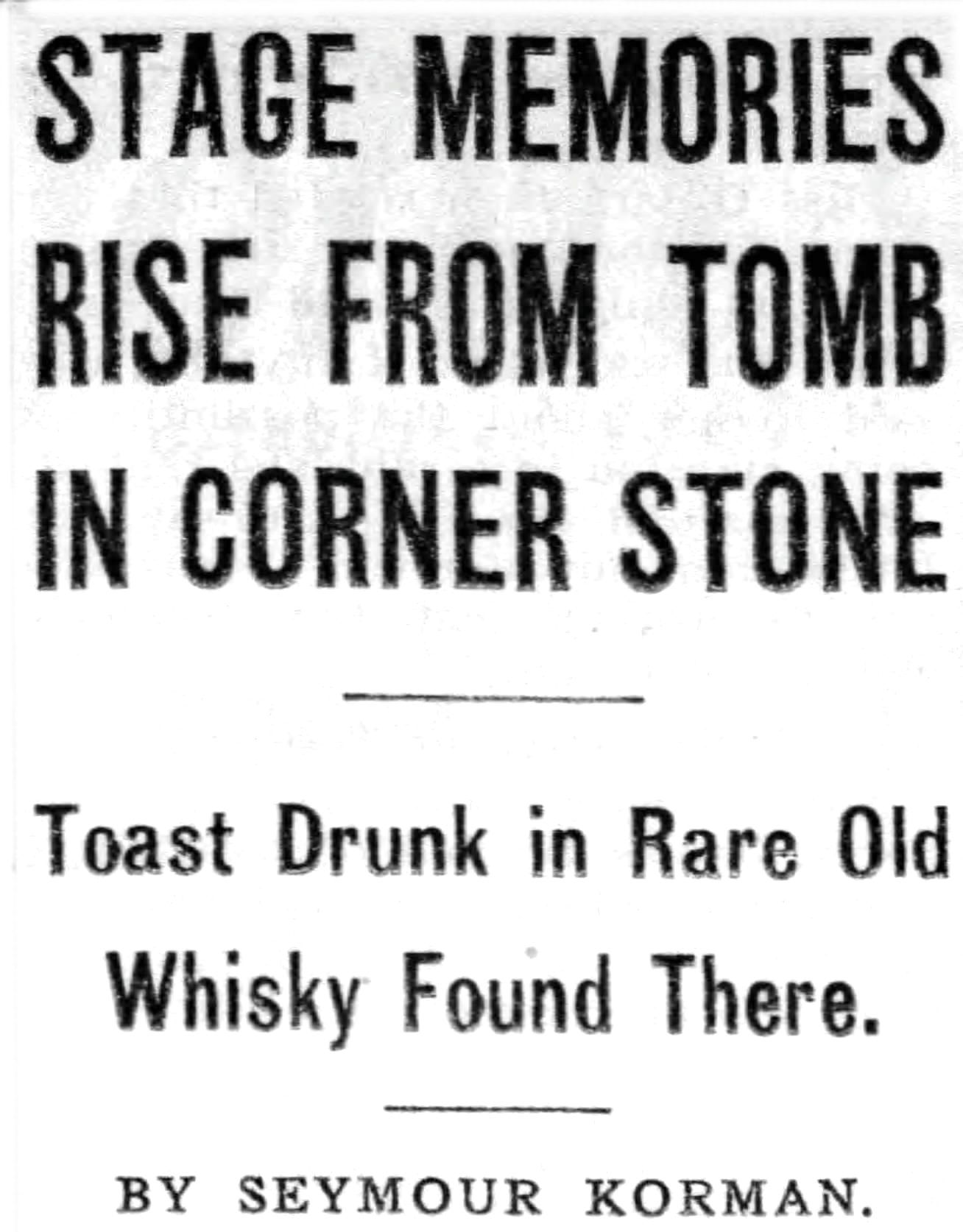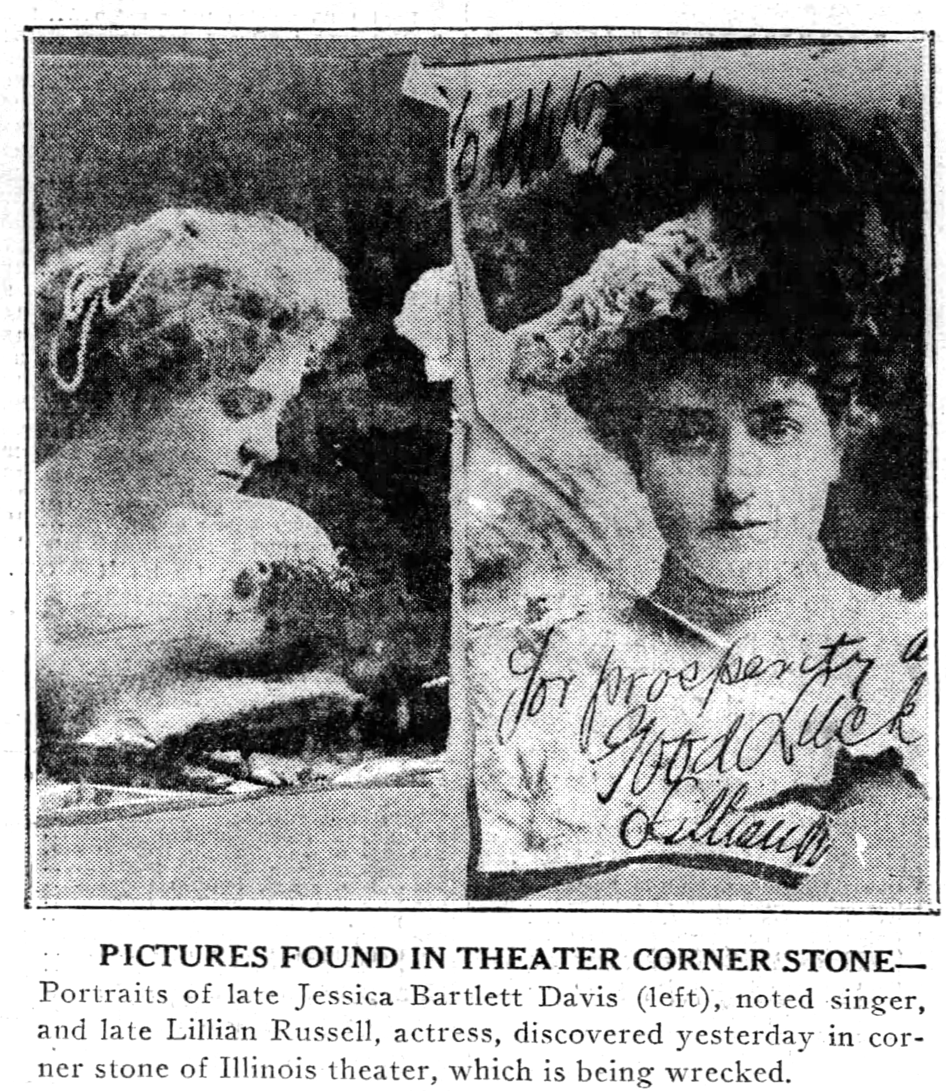Memories of the theater in Chicago a generation ago were revived yesterday when a box containing papers, photographs, and other mementoes [including a bottle of whisky], was opened in the Union League club after it was taken from the corner stone of the old Illinois theater. The box was placed in the corner stone when it was laid May 22, 1900, and was removed early yesterday by workmen who are wrecking the old theater, which stood on Jackson boulevard near Michigan boulevard.