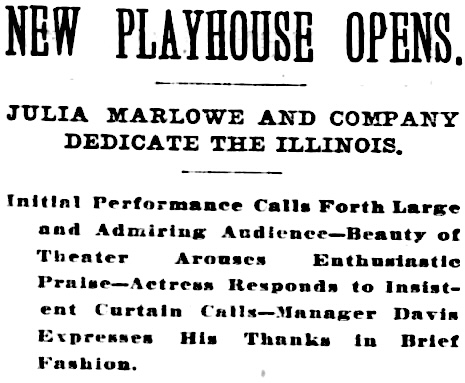 There was a photograph, too, of Julia Marlowe, the great Shakespearian actress. The opening bill of the Illinois theater, on Oct. 15, 1900, presented Miss Marlowe in “Barbara Frietchie.”
